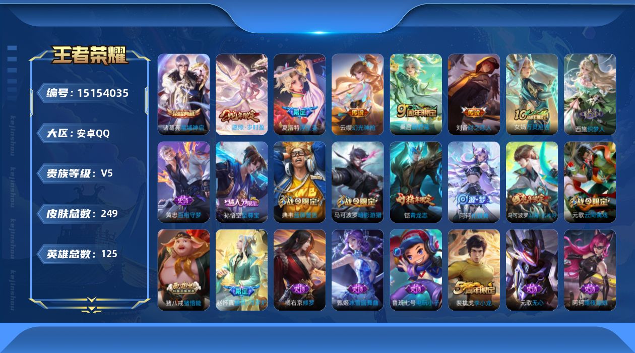 - PX_2077633-实名:,可修改,贵族等级:,V8,英雄数:,124,皮肤数:,245,荣耀水晶:,武则天,鸣剑·曳影,星传说:,幻海之心,传说皮:,海洋之心,限定皮:,冰锋战神,遇见飞天,李小龙,游园惊梦,梁祝,天狼溯光者,逐梦之音,逐梦之星,天狼绘梦者,凤求凰,凤凰于飞,梅西,至尊宝,武陵仙君,高山流水,圣诞老人,猪悟能 【星元皮肤】:武则天幻海之心