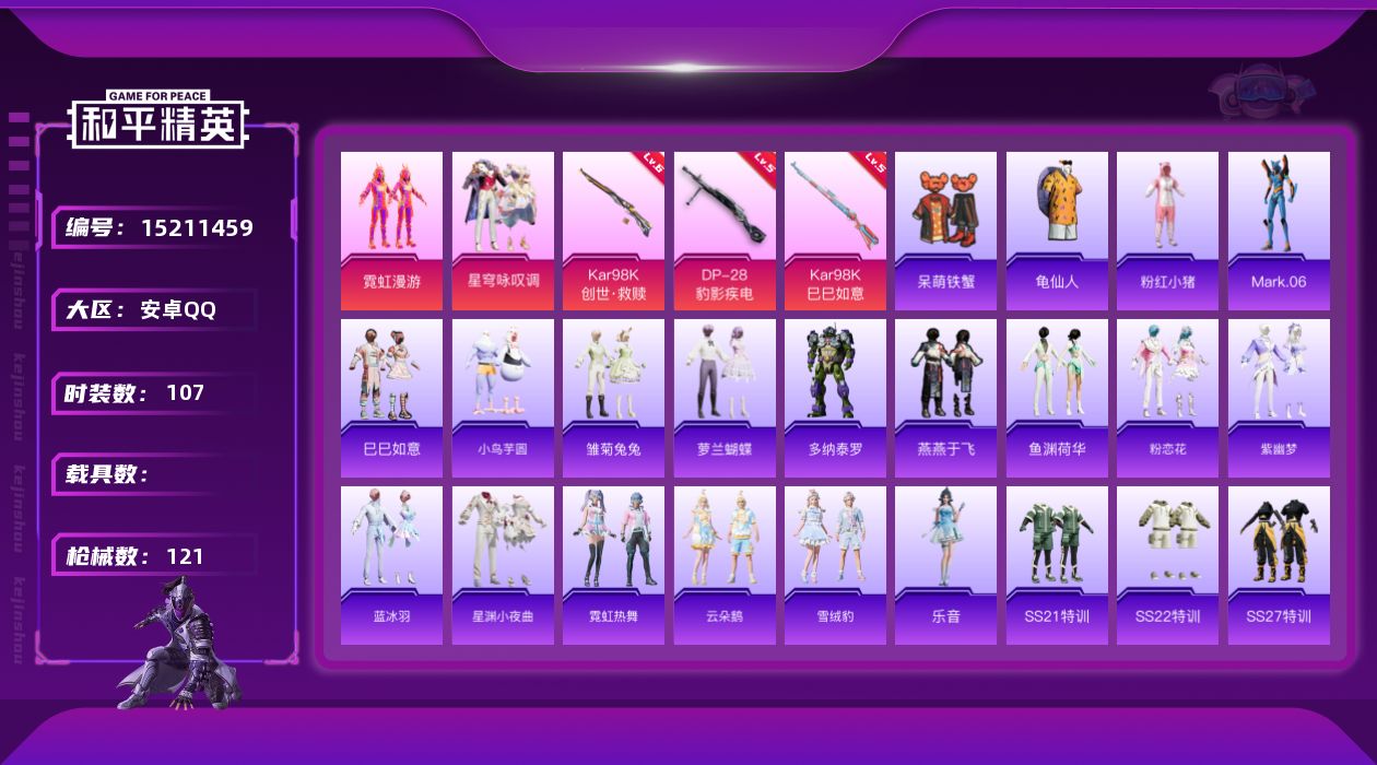 [15211459]可二次【店主推荐捡漏号!可直接换绑】 安卓 手Q-2粉装-3特效枪-0载具-1粉色飞行器-33371热力值-6王牌印记-107套装-121枪皮 【热门品类】:套装-龟仙人,套装-粉红小猪,角色-Mark.06 【粉色套装】:粉装-霓虹漫游,粉装-星穹咏叹调 【粉色枪皮等级】:Kar98K-创世·救赎(六级),Kar98K-巳巳如意(五级),DP-28-豹影疾电(五级) 【粉色枪皮】:Kar98K-创世·救赎,Kar98K-巳巳如意,DP-28-豹影疾电 【粉色降落伞】:蜜语绒猫降落伞,精灵梦叶罗丽降落伞,初号机 觉醒Ver.降落伞,月下星之子降落伞,星穹咏叹调降落伞 【稀有套装】:套装-龟仙人,套装-巳巳如意,套装-小鸟芋圆,套装-雪国风尚,套装-雏菊兔兔,套装-萝兰蝴蝶,角色-多纳泰罗,套装-燕燕于飞,套装-鱼渊荷华,套装-粉恋花,套装-紫幽梦,套装-蓝冰羽,套装-星渊小夜曲,套装-霓虹热舞,套装-云朵鹅,套装-雪绒豹,角色-乐音,套装-雁字回时 【稀有枪皮】:AKM-破晓战魂,AKM-缤纷海域,SCAR-L-夜灯,SCAR-L-玉兔迎春,SCAR-L-小狗蛇点点,SCAR-L-冷漠罗丽,M416-红色方程式,M416-蓝色火焰,AUG-天降萌叽,AUG-甜蜜菠萝,AUG-耀粉歌者,QBZ-彩虹符号,M762-云朵鹅,G36C-桃粉嫣然,G36C-星穹咏叹调,AC-VAL-天降萌叽,蜜獾-天降萌叽,UZI-天降萌叽,UZI-影袭,UMP45-夜灯,UMP45-蓝色火焰,Vector-焰鹰斗篷,Vector-生命誓言,汤姆逊-智耀战神,JS9-蓝晶绮麟,P90-巳巳如意,Kar98K-星穹咏叹调,AWM-焰鹰斗篷,SKS-炫彩节奏,SVD-云朵鹅,SVD-冷漠罗丽,S686-生命誓言,S12K-玩趣呆呆,S12K-破晓战魂,S12K-夜灯,DBS-焰鹰斗篷,DBS-彩虹符号,SPAS-12-云朵鹅,M249-百万伏特,M249-糯团青竹,DP-28-焰鹰斗篷,MG3-幻世战舞者,R45-幻彩电音,短管霰弹-星穹咏叹调,蝎式手枪-六号稻草人,沙漠之鹰-绝色倾城,沙漠之鹰-云朵鹅,战术弩-江南烟雨,爆炸猎弓-雪月幻音,大砍刀-云朵鹅,破片手榴弹-巳巳如意 【其他套装】:套装-SS21特训,套装-SS22特训,套装-SS27特训,套装-SS28特训,套装-SS29特训,