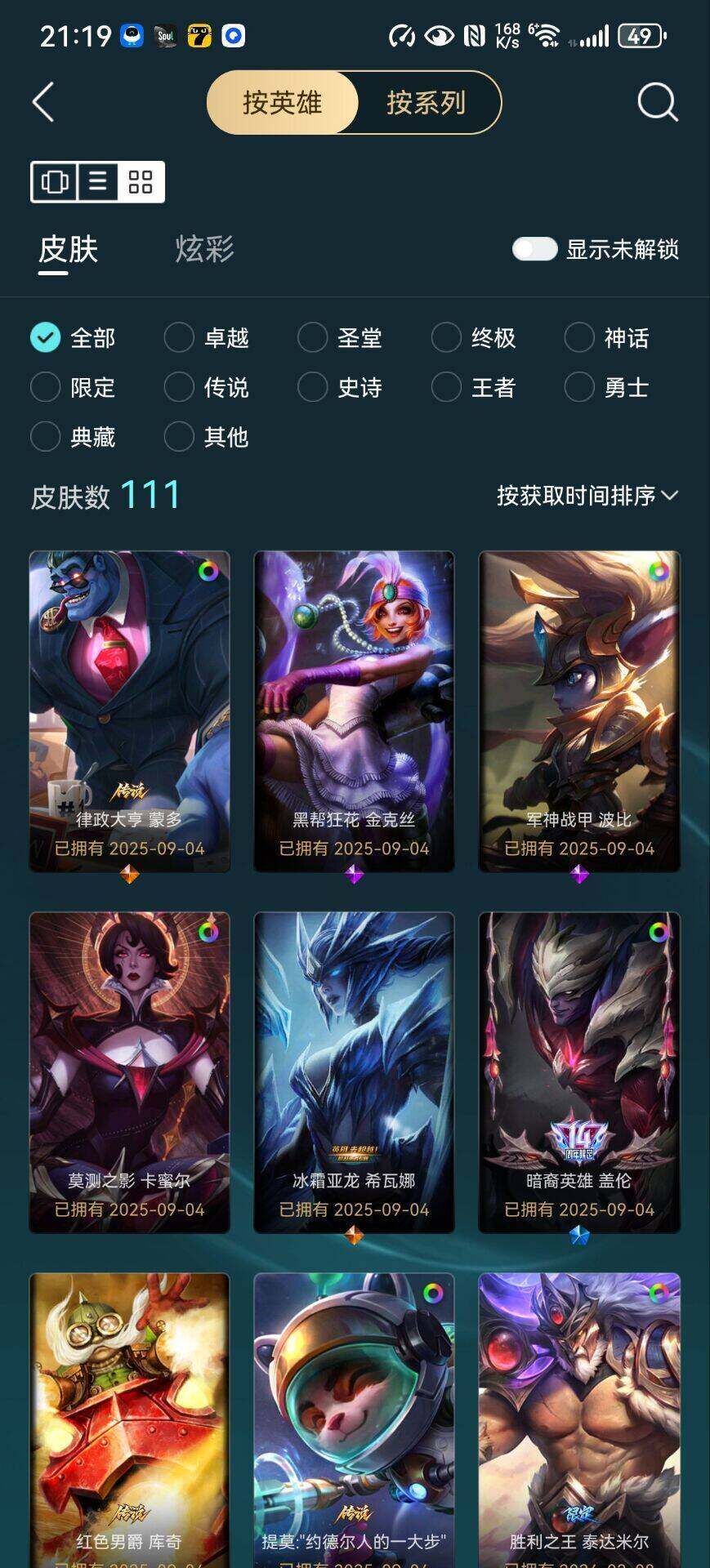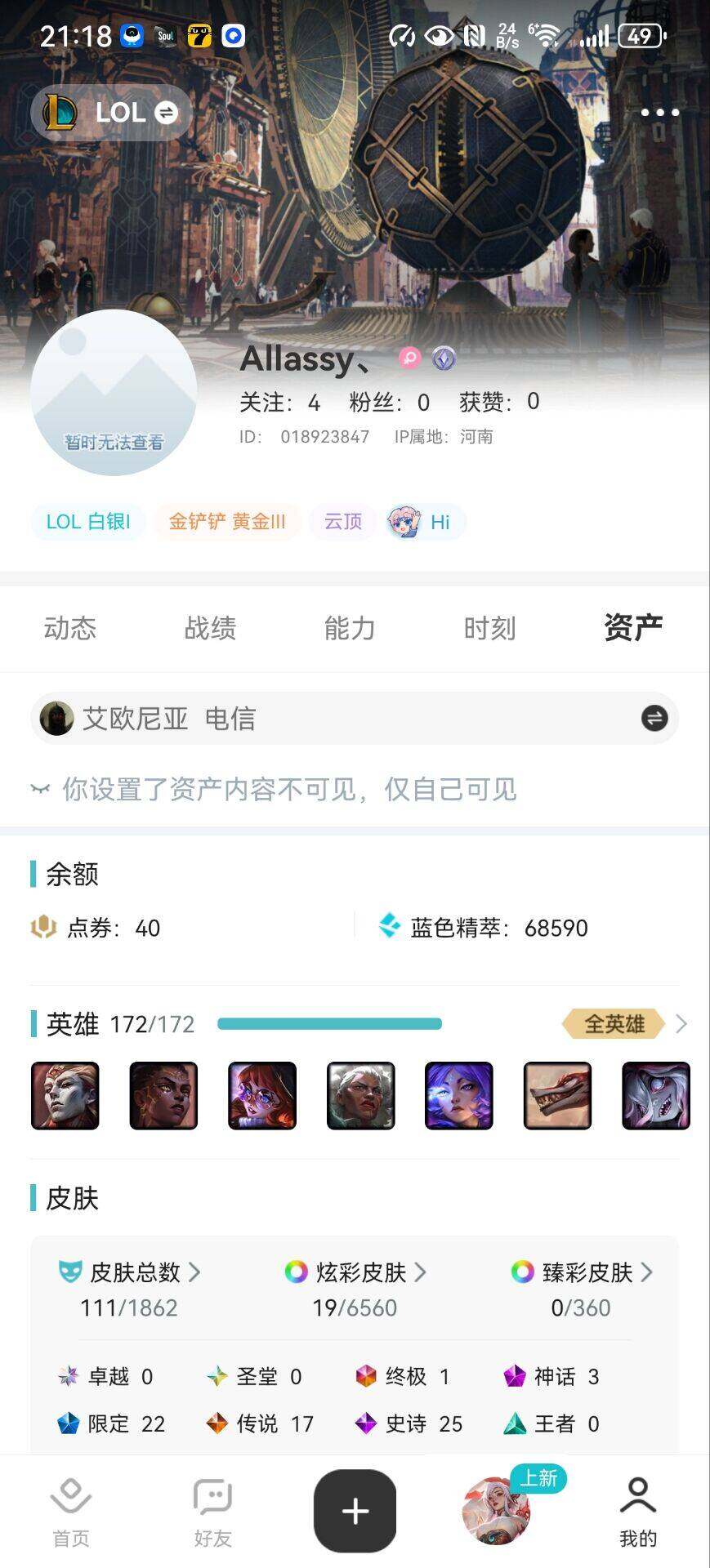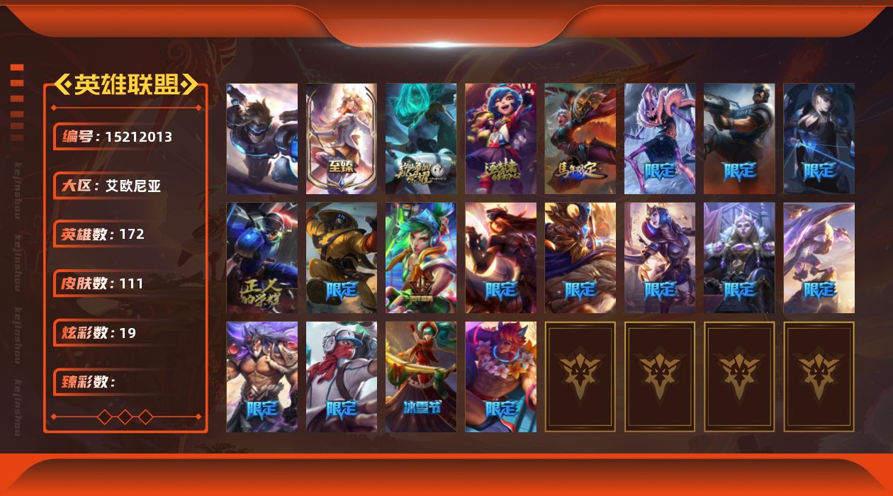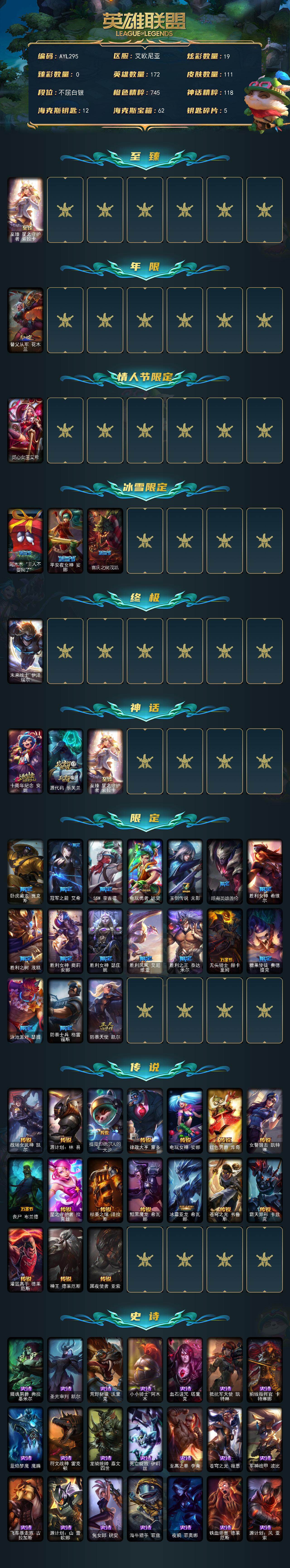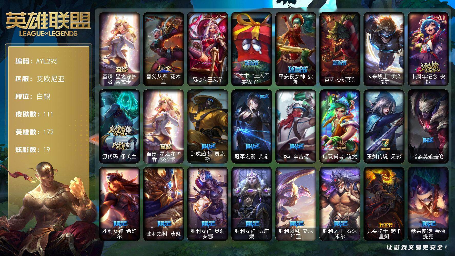 [15212013]【特价出售/店主推荐】白银段位-172英雄-111皮肤-19炫彩-1终极-3神话-22限定-17传说-25史诗