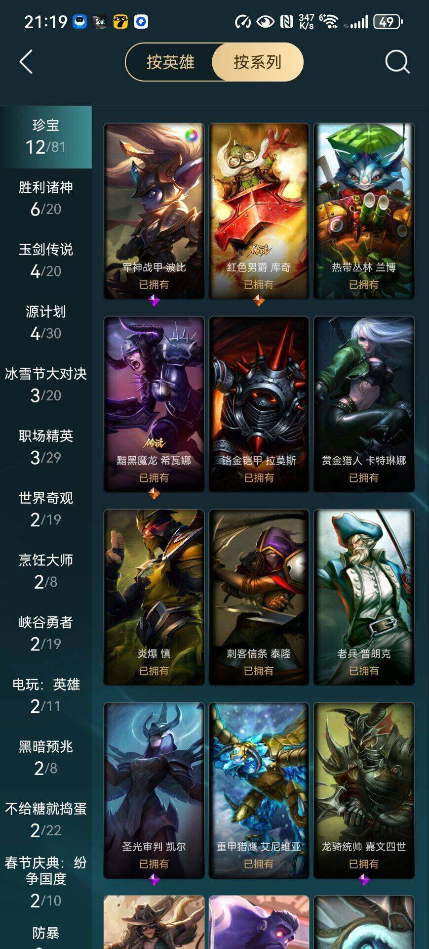 【其他皮肤1】:牛扒狂战奥拉夫,钢铁审判官凯尔,五杀摇滚女声主唱凯尔,勇敢的心艾希,武神贾克斯,黑色天灾辛吉德,北风冻原图奇,横行霸道图奇,暴龙科加斯,铬金铠甲拉莫斯,重甲猎鹰艾尼维亚,硬汉蒙多,莲花之令艾瑞莉娅,老兵普朗克,珊瑚礁墨菲特,赏金猎人卡特琳娜,腥红之月卡特琳娜,创世之神茂凯,猛龙雷克顿,吕布奉先,猎天使魔女薇恩,热带丛林兰博,狮子星神奈德丽,诺克萨斯波比,品酒大师古拉加斯,斯巴达之魂潘森,英仙座珀尔修斯潘森,五杀摇滚吉他手莫德凯撒,刺客信条泰隆,炎爆慎,KDAALLOUT阿狸,韦鲁斯迅箭,玉剑传说无双,未来战士菲奥娜,邪恶女巫璐璐,睡衣守护者璐璐,魔女婕拉,莫测之影卡蜜尔,铁拳执事蔚,玉剑传说寒潭夭夭,灵魂莲华永