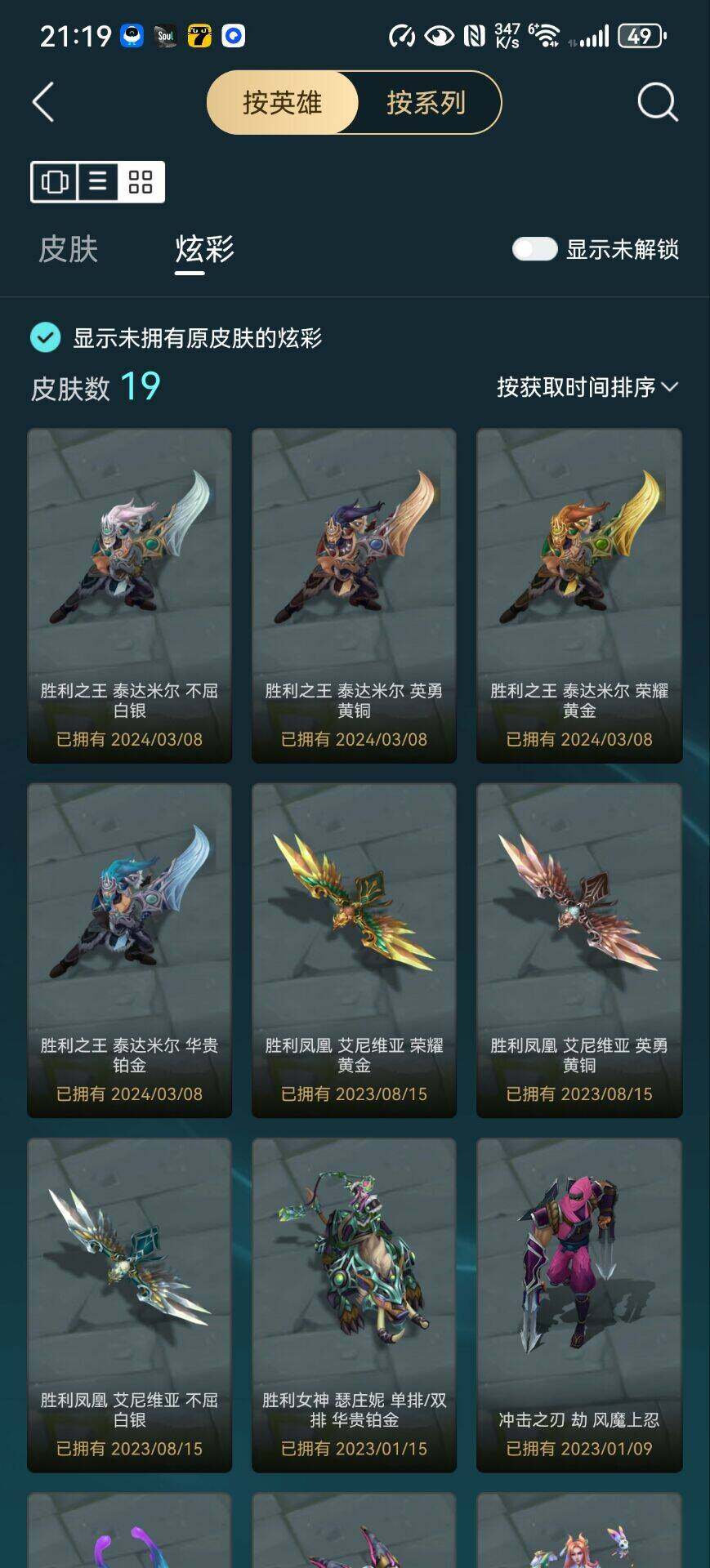 【限定皮肤】:卧虎藏龙贾克斯,冠军之箭艾希,SSW辛吉德,电玩勇者锐雯,玉剑传说无影,暗裔英雄盖伦,胜利女神希维尔,胜利之树茂凯,胜利女神奥莉安娜,胜利女神瑟庄妮,胜利凤凰艾尼维亚,胜利之王泰达米尔,无头骑士赫卡里姆,糖果使徒费德提克,泳池派对瑟提,防暴士兵格雷福斯,防暴天使凯尔