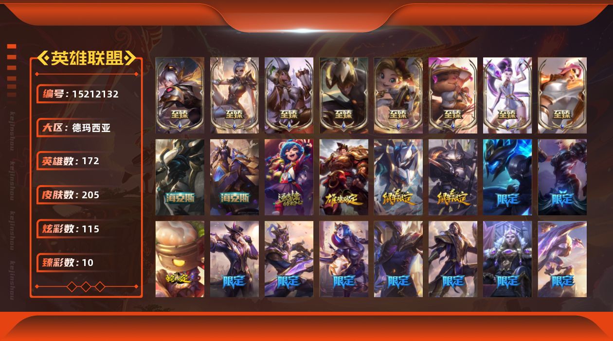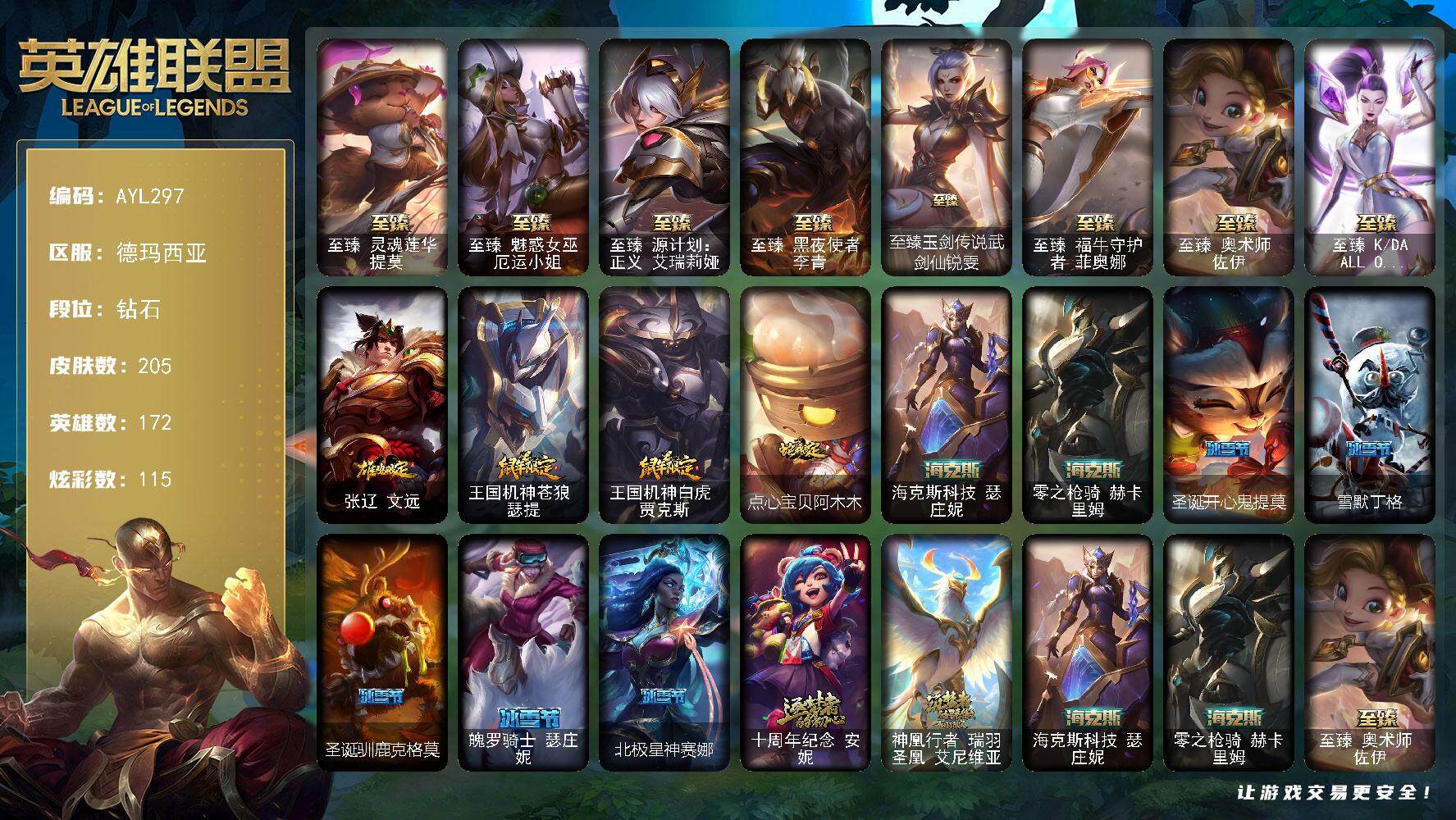 钻石段位-172英雄-205皮肤-115炫彩-0终极-12神话-30限定-24传说-39史诗