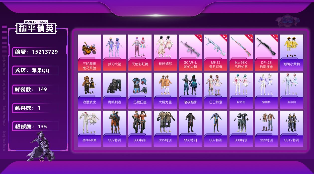 [15213729]可二次【店主推荐捡漏号!可直接换绑】 苹果 手Q-3粉装-4特效枪-1载具-2粉色飞行器-4.7w热力值-4王牌印记-149套装-135枪皮【热门品类】:粉装-梦幻火箭,套装-潮萌小黄鸭,套装-浪漫波比【粉色载具】:鬼马风驰【粉色套装】:粉装-天使彩虹糖,粉装-梦幻火箭,粉装-桃粉嫣然【粉色枪皮等级】:SCAR-L-梦幻火箭(七级),Kar98K-巳巳如意(五级),MK12-雪月幻音(六级),DP-28-豹影疾电(三级)【粉色飞行器】:梦幻火箭飞行器,繁龙极客飞行器