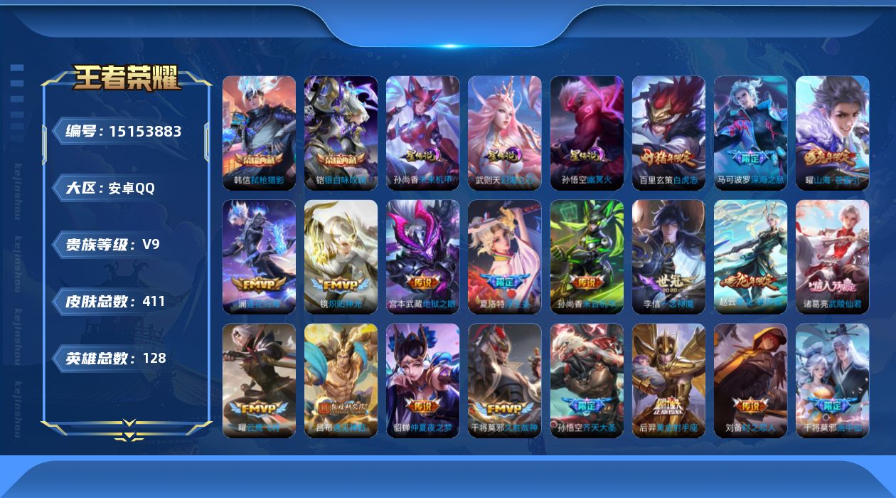 [15153883]【店主推荐捡漏号!可直接换绑】安卓Q-V9-最强王者段位-128英雄-411皮肤-2典藏-33传说-133史诗