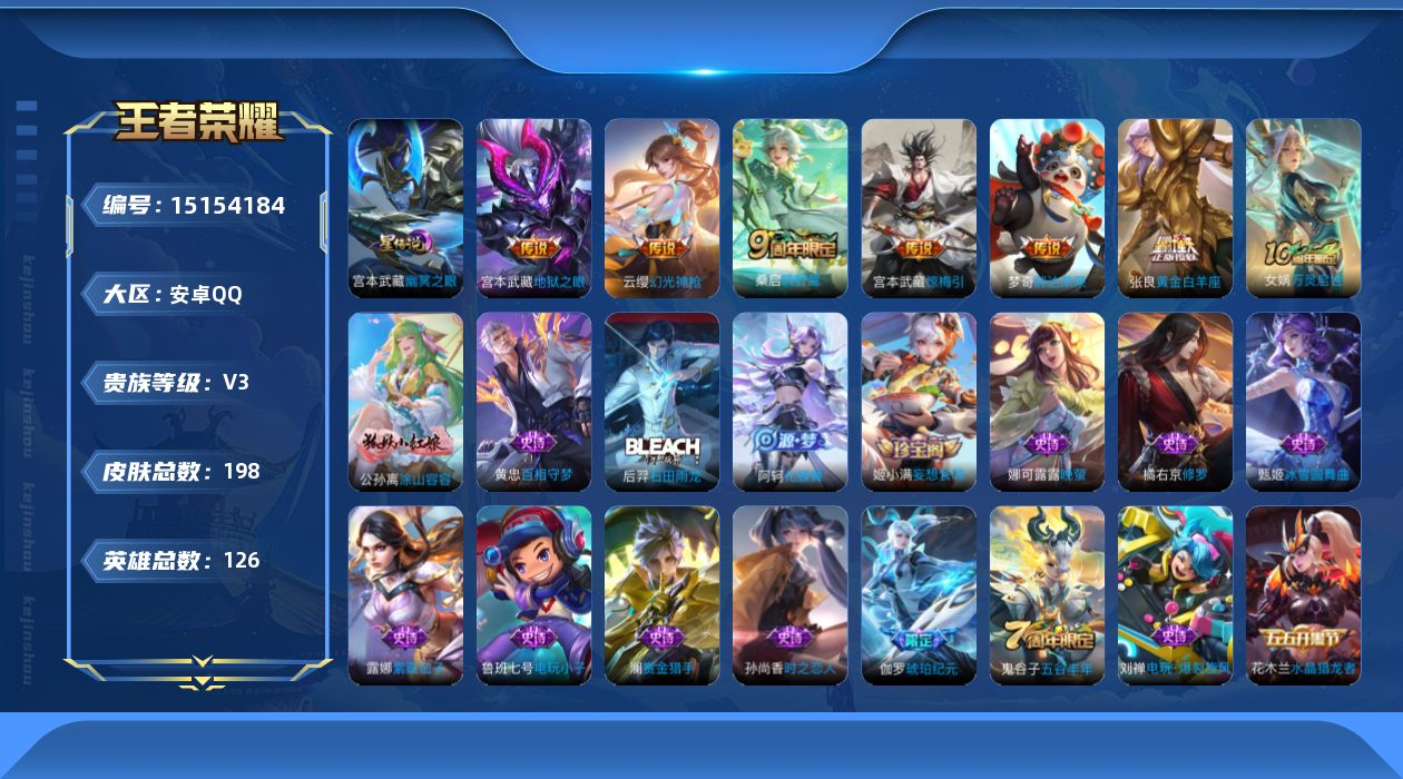[15154184]可二次【店主推荐捡漏号!可直接换绑】,安卓Q-V3-最强王者段位-126英雄-198皮肤-7传说-53史诗 【传说皮肤】:后羿神树通天,云缨幻光神枪,桑启鸣野蒿,宫本武藏惊梅引,张良黄金白羊座,梦奇胖达荣荣,宫本武藏地狱之眼 【限定皮肤】:蒙犽顽岩魄,姜子牙天穹之誓,杨戬破阵退雄兵,狄仁杰阴阳师,赵云百木心枪,孙尚香蔷薇恋人,庄周高山流水,达摩沙漠行僧,兰陵王金庭之子,李元芳云中旅人,钟馗驱傩正仪,杨玉环遇见飞天,蔡文姬繁星吟游,鬼谷子五谷丰年,苏烈千军破阵,沈梦溪大漠名商,裴擒虎擒涛扼浪,上官婉儿梁祝,鲁班大师探海日志,桑启海盐诗旅,阿古朵江河有灵,张良古海寻踪,蒙犽百解令,鬼谷子天穹祈灯,伽罗琥珀纪元,姬小满妄想食味,刘邦剑破天穹,程咬金群星魔术团,周瑜熔金海岸 【赛季限定】:达摩沙漠行僧,兰陵王金庭之子,张良古海寻踪,李元芳云中旅人,钟馗驱傩正仪,苏烈千军破阵,沈梦溪大漠名商,裴擒虎擒涛扼浪,鲁班大师探海日志,桑启海盐诗旅,鬼谷子天穹祈灯,刘邦剑破天穹,姜子牙天穹之誓 【史诗皮肤】:鲁班七号电玩小子,露娜紫霞仙子,赵云未来纪元,甄姬冰雪圆舞曲,王昭君偶像歌手,宫本武藏鬼剑武藏,孙尚香蔷薇恋人,孙尚香水果甜心,妲己魅力维加斯,妲己女仆咖啡,墨子金属风暴,吕布圣诞狂欢,刘禅绅士熊喵,吕布末日机甲,张飞乱世虎臣,花木兰水晶猎龙者,刘邦德古拉伯爵,夏侯惇乘风破浪,小乔缤纷独角兽,兰陵王暗隐猎兽者,诸葛亮黄金分割率,雅典娜冰冠公主,百里守约特工魅影,蔡文姬舞动绿茵,李元芳逐浪之夏,程咬金功夫厨神,白起星夜王子,杨玉环遇见飞天,孙策猫狗日记,狄仁杰鹰眼统帅,上官婉儿梁祝,蔡文姬繁星吟游,娜可露露晚萤,橘右京修罗,孙尚香时之恋人,沈梦溪月团寄思,庄周高山流水,赵云百木心枪,澜赏金猎手,鬼谷子五谷丰年,刘禅电玩爆裂旋风,阿古朵江河有灵,蒙犽百解令,周瑜雪夜绮愿,伽罗琥珀纪元,姬小满妄想食味,蒙犽顽岩魄,弈星万物之道,阿轲化蝶舞,后羿石田雨龙,黄忠百相守梦,公孙离涂山容容,女娲万灵启世 【其他皮肤】:韩信教廷特使,韩信街头霸王,露娜哥特玫瑰,阿轲爱心护理,赵云白执事,赵云忍炎影,白起白色死神,扁鹊化身博士,扁鹊救世之瞳,宫本武藏未来纪元,安琪拉玩偶对对碰,姜子牙时尚教父,妲己少女阿狸,典韦黄金武士,亚瑟死亡骑士,花木兰兔女郎,张飞五福同心,甄姬花好人间,宫本武藏万象初新,后羿