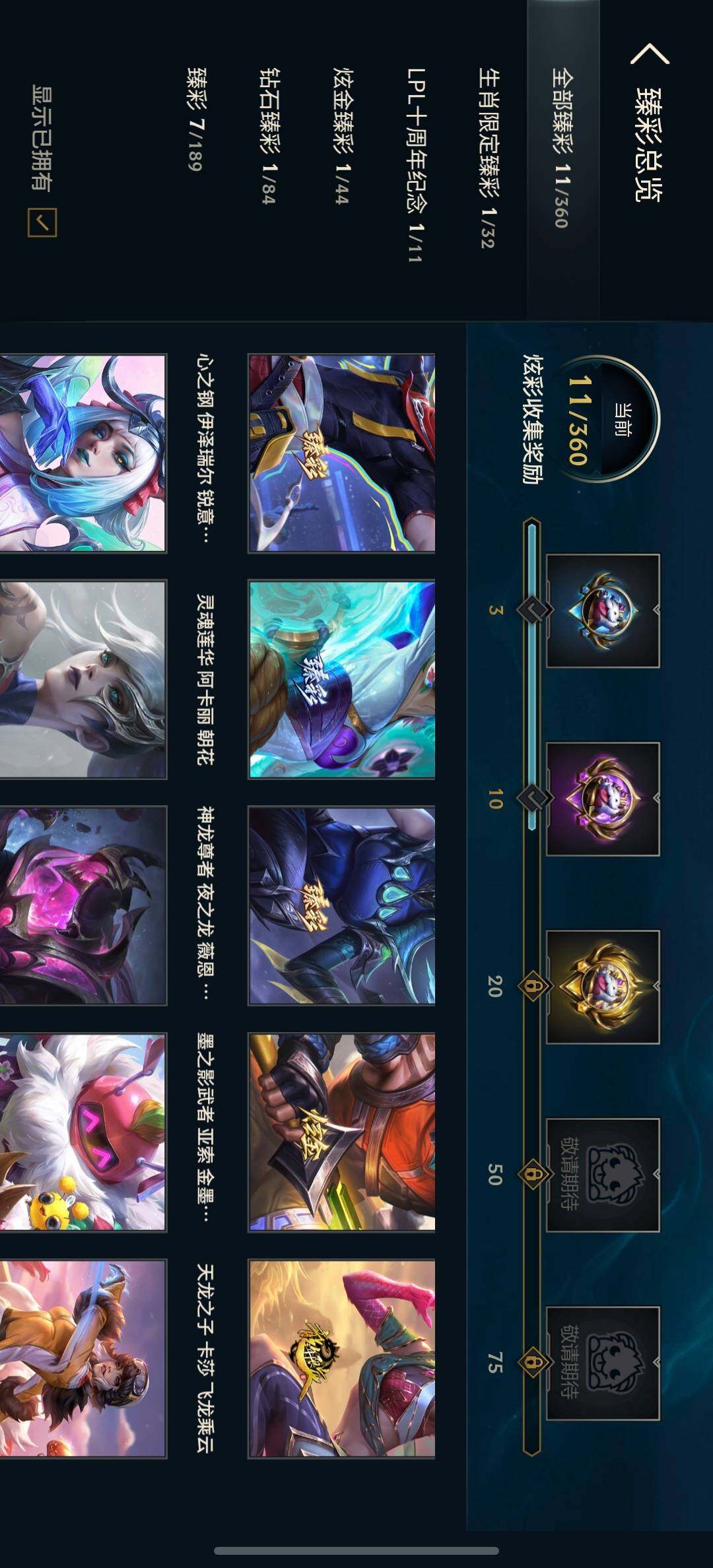 【臻彩皮肤】:天龙之子卡莎飞龙乘云,无畏骑士瑟庄妮赤子初心,墨之影武者亚索金墨耀影,天煞劫恒星游历者,星之守护者金克丝黑洞,可爱可爱粉红红布里茨,魔女阿卡丽虚荣,净雪之月莫甘娜冬虹,神龙尊者夜之龙薇恩集仙,心之钢伊泽瑞尔锐意曲风