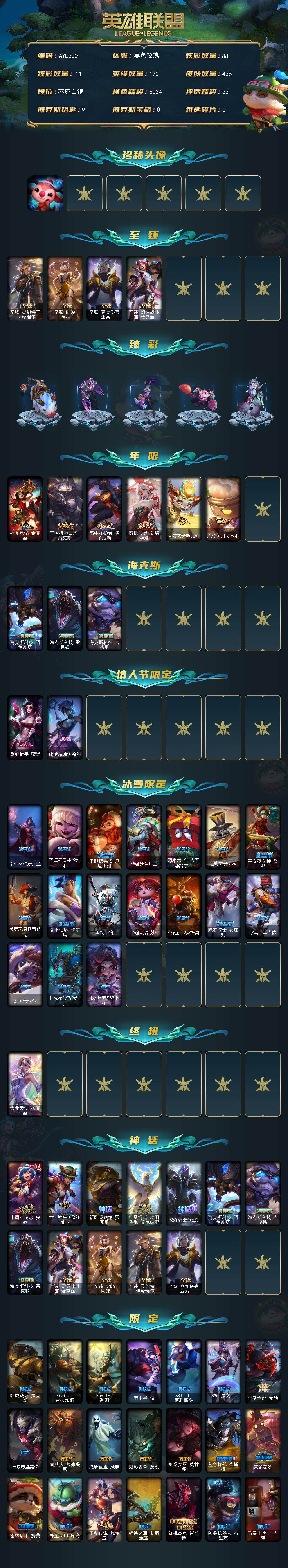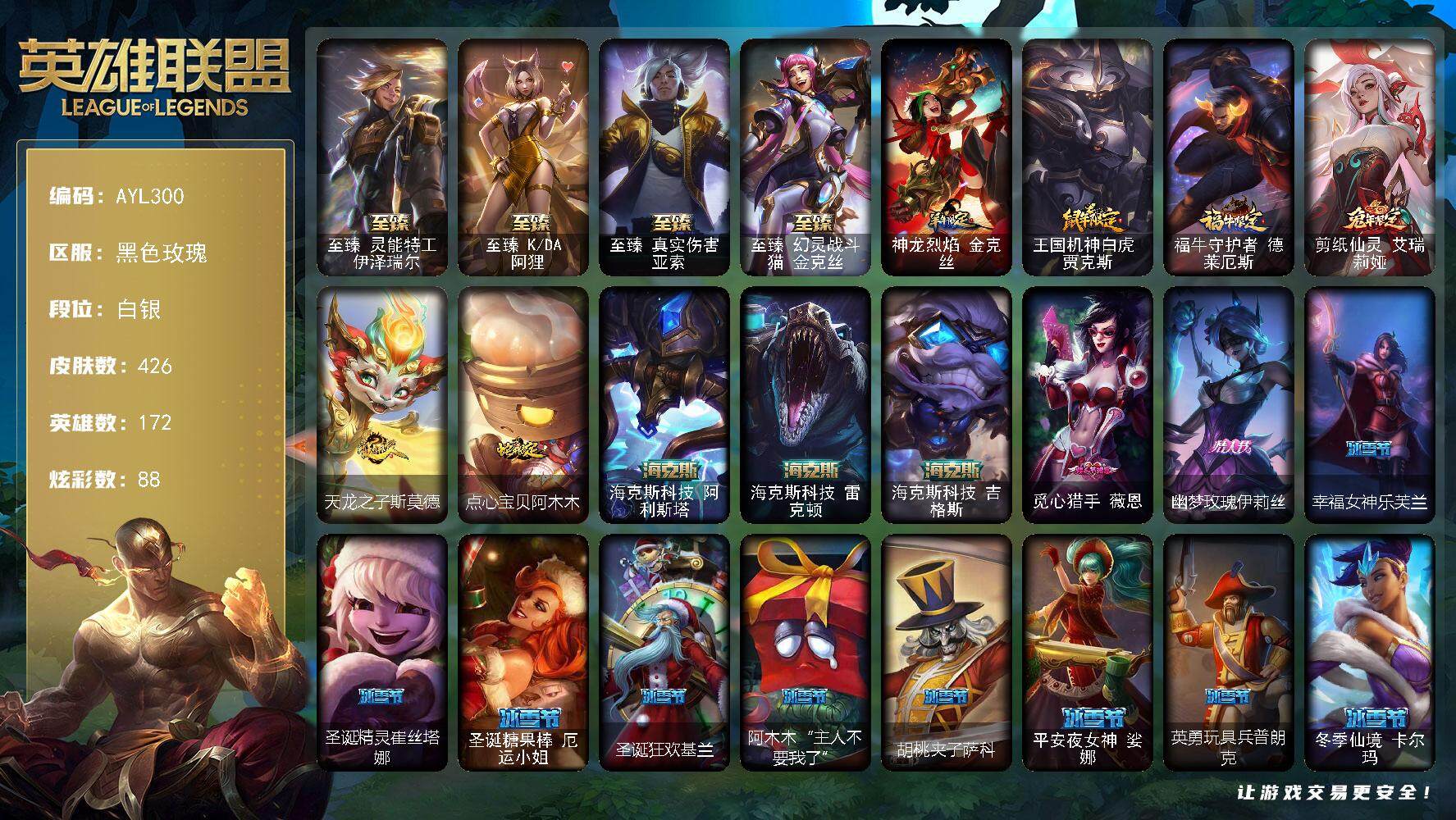 [15216427]【店主推荐捡漏号!可直接换绑】白银段位-172英雄-426皮肤-88炫彩-1终极-12神话-48限定-47传说-102史诗 【珍稀头像】:至爱的鹿头像 【至臻皮肤】:至臻灵能特工伊泽瑞尔,至臻KDA阿狸,至臻真实伤害亚索,至臻幻灵战斗猫金克丝 【臻彩皮肤】:天龙之子卡莎飞龙乘云,无畏骑士瑟庄妮赤子初心,墨之影武者亚索金墨耀影,天煞劫恒星游历者,星之守护者金克丝黑洞,可爱可爱粉红红布里茨,魔女阿卡丽虚荣,净雪之月莫甘娜冬虹,神龙尊者夜之龙薇恩集仙,心之钢伊泽瑞尔锐意曲风 【年限皮肤】:神龙烈焰金克丝,王国机神白虎贾克斯,福牛守护者德莱厄斯,剪纸仙灵艾瑞莉娅,天龙之子斯莫德,点心宝贝阿木木 【海克斯皮肤】:海克斯科技阿利斯塔,海克斯科技雷克顿,海克斯科技吉格斯 【情人节限定】:觅心猎手薇恩,幽梦玫瑰伊莉丝 【冰雪限定】:幸福女神乐芙兰,圣诞精灵崔丝塔娜,圣诞糖果棒厄运小姐,圣诞狂欢基兰,阿木木“主人不要我了”,胡桃夹子萨科,平安夜女神娑娜,英勇玩具兵普朗克,冬季仙境卡尔玛,雪默丁格,圣诞玩偶波比,圣诞驯鹿克格莫,魄罗骑士瑟庄妮,冰雪节辛吉德,冰雪兽纳尔,北极星使者沃里克,北极星守望者佐伊 【终极皮肤】:大元素使拉克丝 【神话皮肤】:十周年纪念安妮,十五周年纪念希维尔,新卧虎藏龙贾克斯,神凰行者瑞羽圣凰艾尼维亚,灰烬骑士派克,海克斯科技阿利斯塔,海克斯科技吉格斯,海克斯科技雷克顿,至臻真实伤害亚索,至臻幻灵战斗猫金克丝,至臻KDA阿狸,至臻灵能特工伊泽瑞尔 【限定皮肤】:卧虎藏龙贾克斯,Fnatic古拉加斯,Fnatic迦娜,暗杀星慎,SKTT1阿利斯塔,SSG嘉文四世,玉剑传说无劫,暗裔英雄盖伦,南瓜头费德提克,鬼影重重魔腾,鬼影森森茂凯,魅惑女巫莫甘娜,蓝色忧郁崔斯特,蒙多蒙多,密林猎手提莫,外星装甲库奇,玉剑传说舞龙卫,钢铁之翼艾尼维亚,红桃杰克崔斯特,防暴机器人布里茨,防暴士兵辛吉德,防暴天使凯尔,双城之战2微光实验室辛吉德 【传说皮肤】:铁哥们儿奥拉夫,地狱之门卫士加里奥,战地机甲厄加特,血石领主弗拉基米尔,大天使长米迦勒凯尔,战场女武神凯尔,源计划林易,恶魔男爵瑞兹,约德尔国队长提莫,欧米伽小队幽灵特工,烈焰雄心崔丝塔娜,合金巨兽努努和威朗普,幻灵战斗队长厄运小姐,女皇艾希,源计划联合艾希,西部天使艾希,恶魔之刃泰达米尔,绅士科加斯,律政大亨蒙多,电玩女神娑