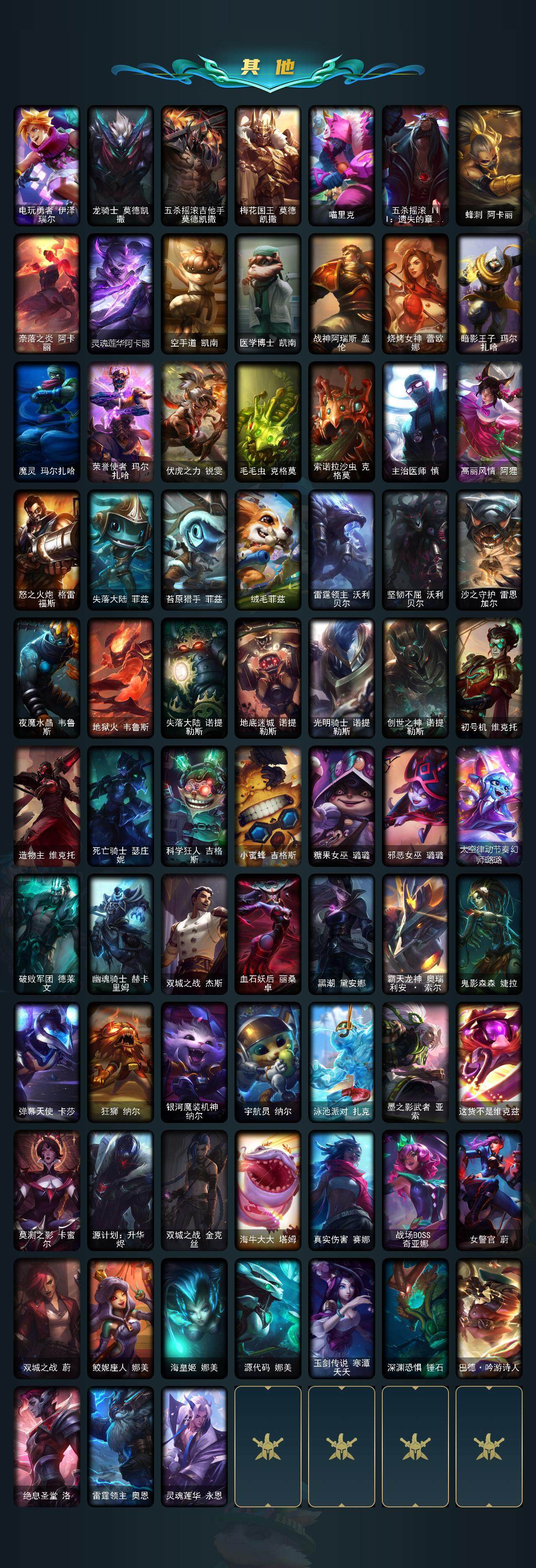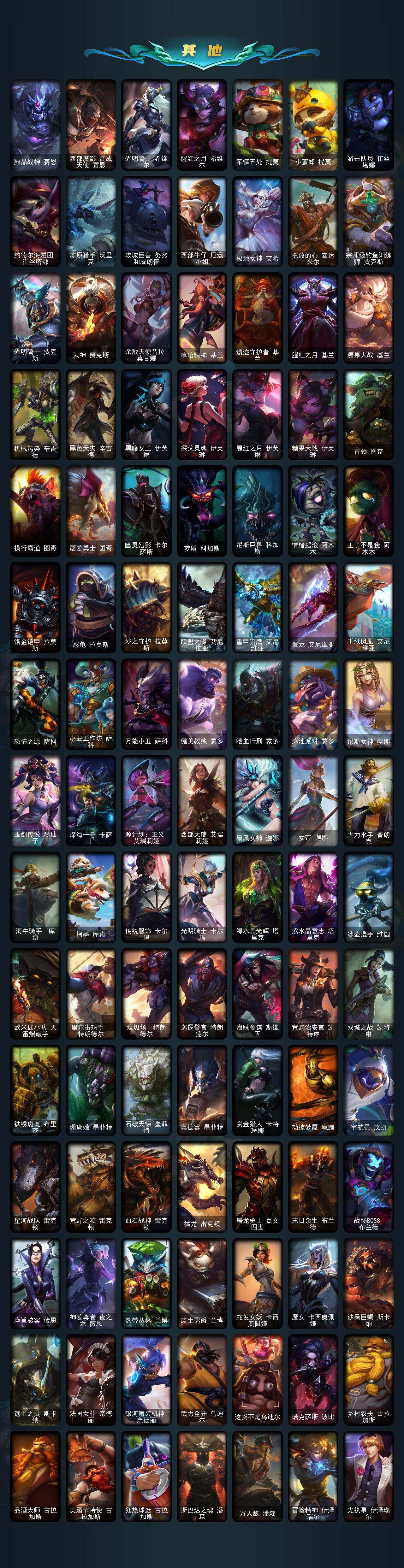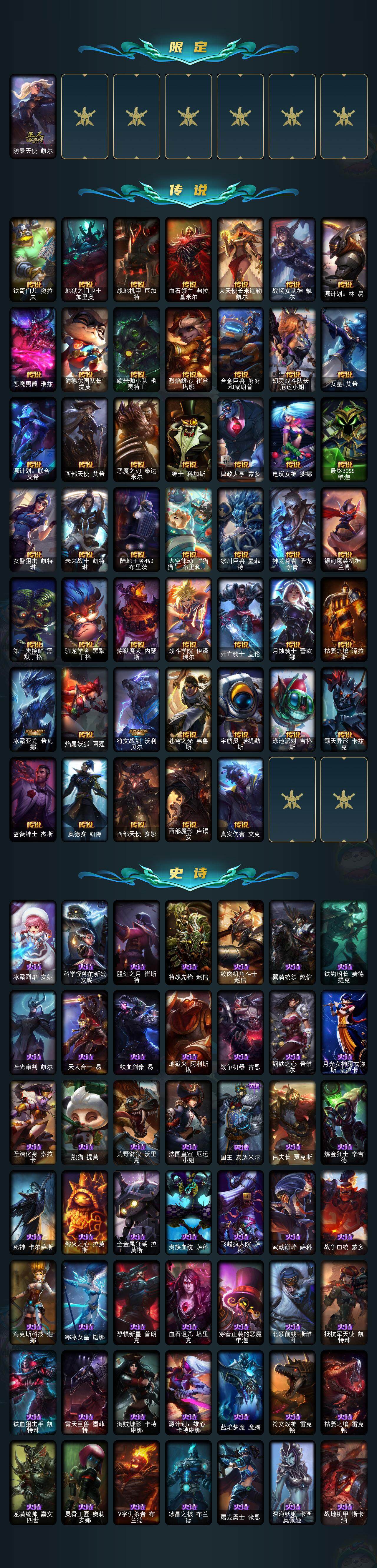 【传说皮肤】:铁哥们儿奥拉夫,地狱之门卫士加里奥,战地机甲厄加特,血石领主弗拉基米尔,大天使长米迦勒凯尔,战场女武神凯尔,源计划林易,恶魔男爵瑞兹,约德尔国队长提莫,欧米伽小队幽灵特工,烈焰雄心崔丝塔娜,合金巨兽努努和威朗普,幻灵战斗队长厄运小姐,女皇艾希,源计划联合艾希,西部天使艾希,恶魔之刃泰达米尔,绅士科加斯,律政大亨蒙多,电玩女神娑