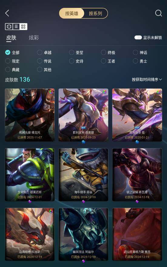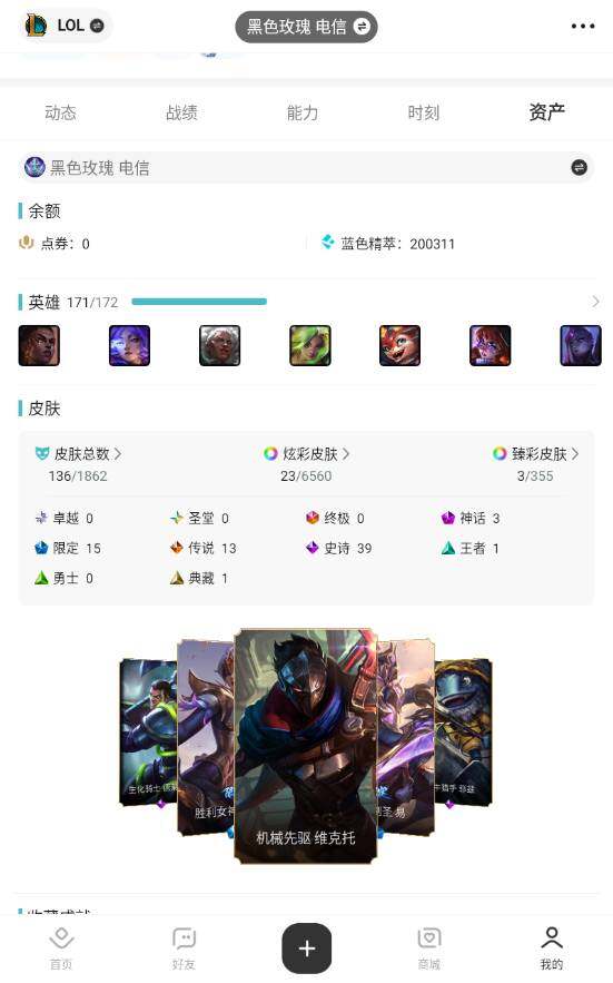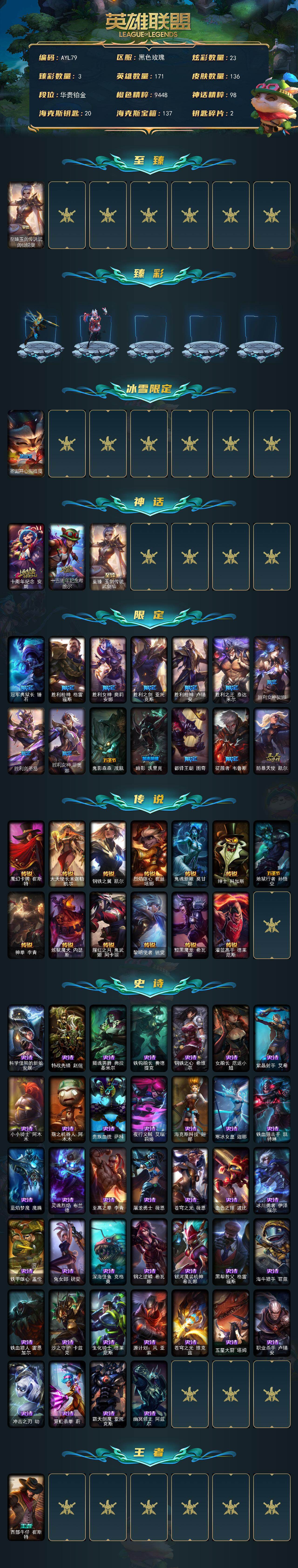 铂金段位-171英雄-136皮肤-23炫彩-0终极-3神话-15限定-13传说-39史诗