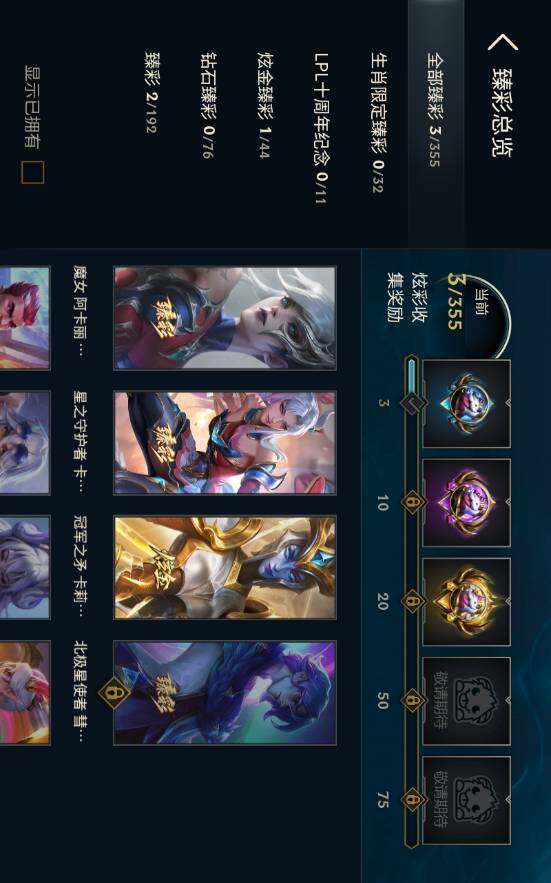 【臻彩皮肤】:冠军之矛卡莉丝塔凯旋圣装,星之守护者卡莎热情之光,魔女阿卡丽虚荣