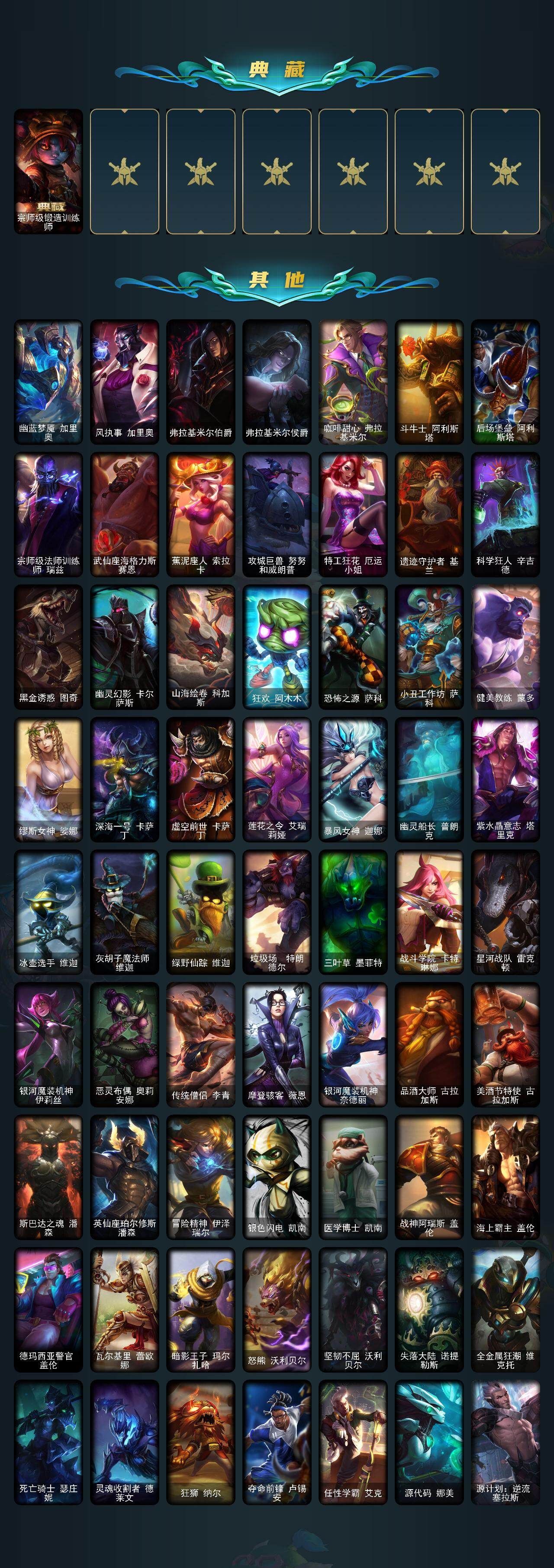【其他皮肤1】:幽蓝梦魇加里奥,风执事加里奥,弗拉基米尔伯爵,弗拉基米尔侯爵,咖啡甜心弗拉基米尔,斗牛士阿利斯塔,后场堡垒阿利斯塔,宗师级法师训练师瑞兹,武仙座海格力斯赛恩,蕉泥座人索拉卡,攻城巨兽努努和威朗普,特工狂花厄运小姐,遗迹守护者基兰,科学狂人辛吉德,黑金诱惑图奇,幽灵幻影卡尔萨斯,山海绘卷科加斯,狂欢阿木木,恐怖之源萨科,小丑工作坊萨科,健美教练蒙多,缪斯女神娑娜,深海一号卡萨丁,虚空前世卡萨丁,莲花之令艾瑞莉娅,暴风女神迦娜,幽灵船长普朗克,紫水晶意志塔里克,冰壶选手维迦,灰胡子魔法师维迦