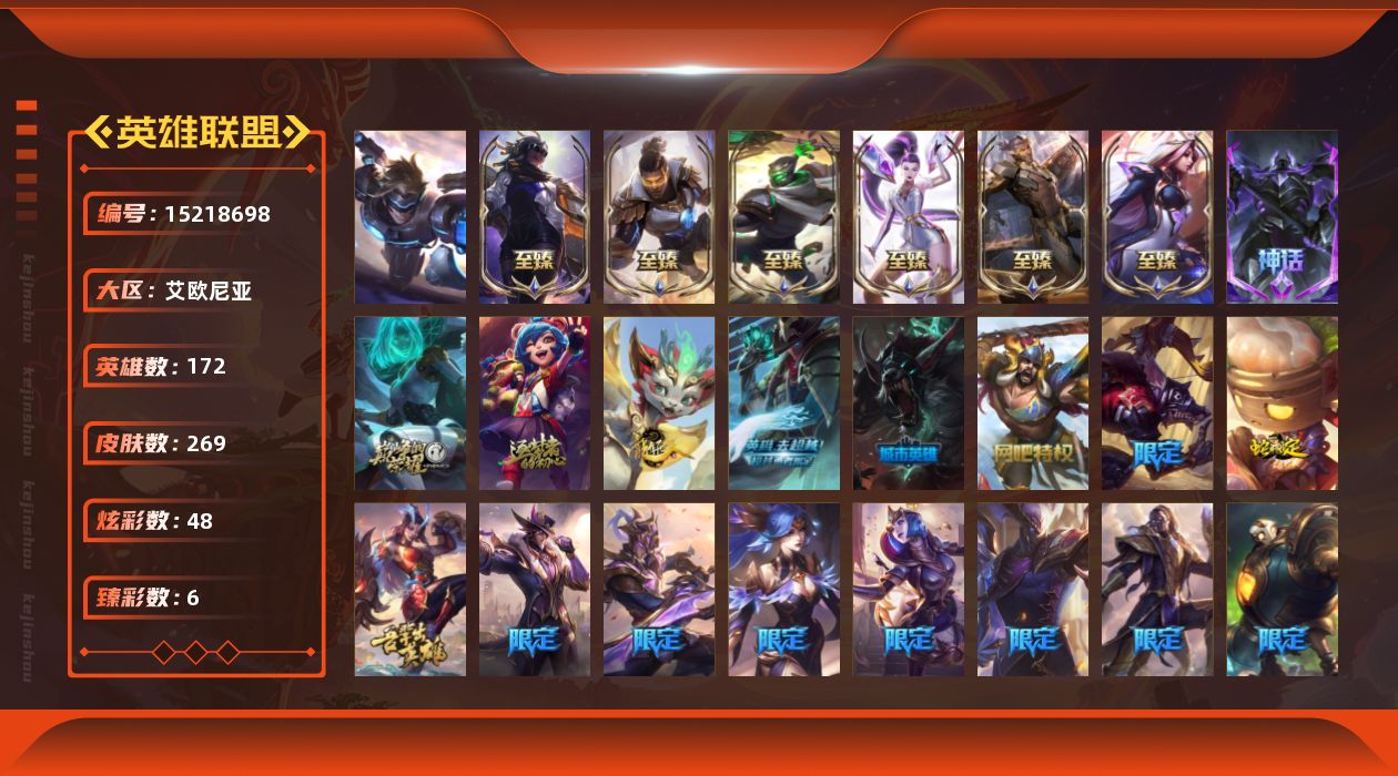 [15218698]未定级段位-172英雄-269皮肤-48炫彩-1终极-10神话-28限定-26传说-69史诗