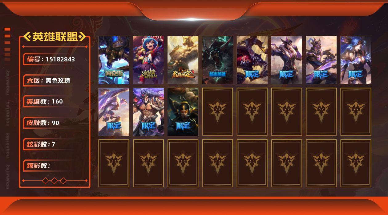 青铜段位-160英雄-90皮肤-7炫彩-0终极-2神话-10限定-12传说-27史诗