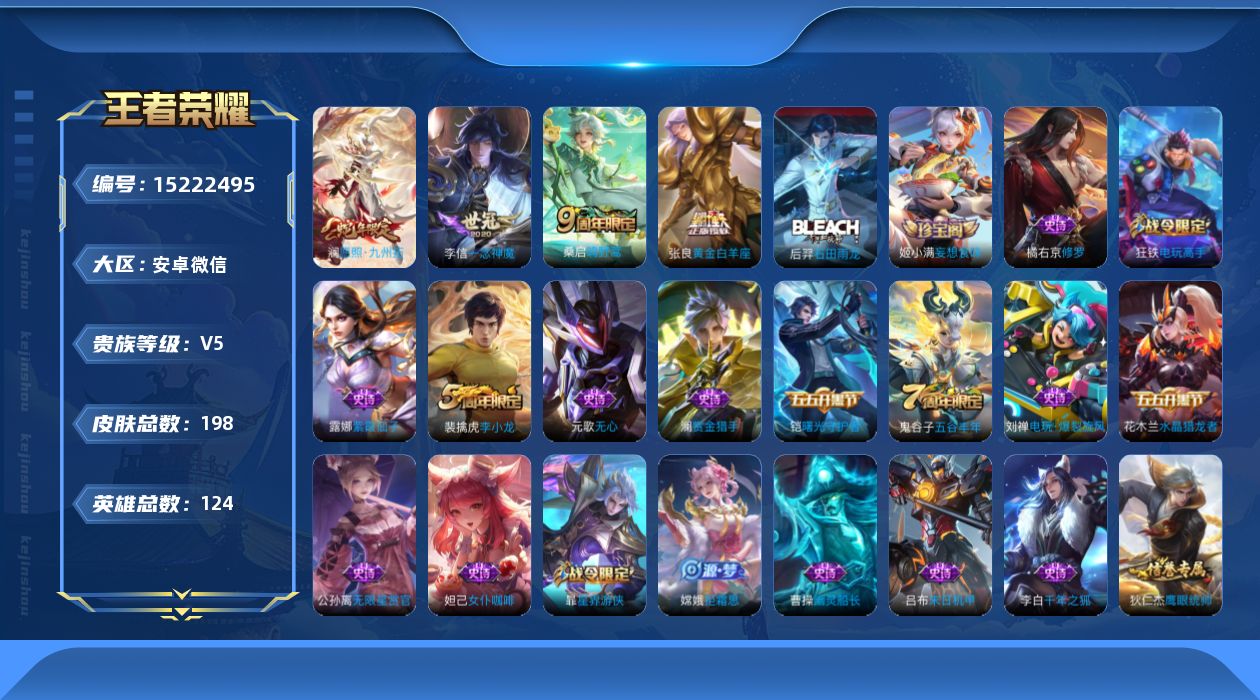 - PX_2096848-实名: 可修改 贵族等级: V7 英雄数: 122 皮肤数: 242 传说皮: 黄金射手座,挚爱之约,神器·狴犴令,山海·炽霜斩,燃星之曲,浮生妄,幻光神枪 限定皮: 李小龙,奔雷神使,梁祝,龙胆,寅虎·御盾,武陵仙君,高山流水,猪悟能,时之祈愿-云中君,时之祈愿-瑶,百木心枪,玉兔公主,匿光决锋者,深海之息,五谷丰年,鸣野蒿,逐霄战戟,愿照·山河定