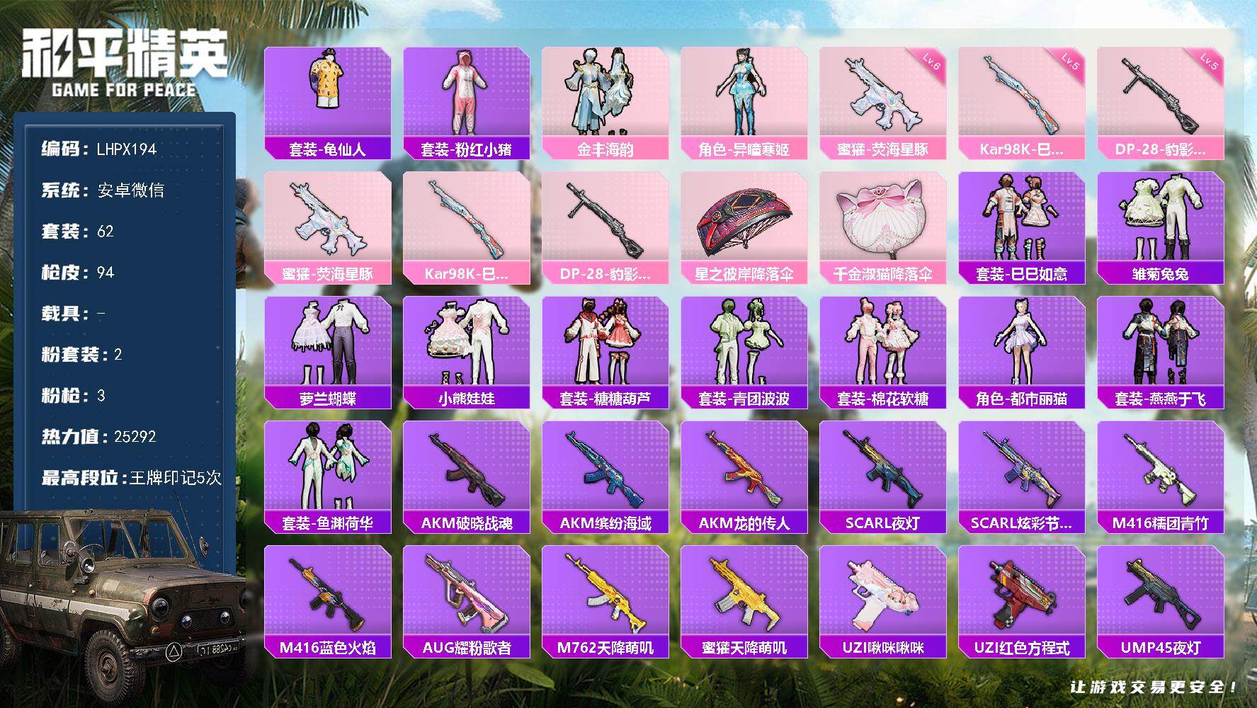 [15222973]【特价出售/店主推荐】安卓 微信-2粉装-3特效枪-0载具-0粉色飞行器-25292热力值-5王牌印记-62套装-94枪皮 【热门品类】:套装-龟仙人,套装-粉红小猪 【粉色套装】:粉装-金丰海韵,角色-异瞳寒姬 【粉色枪皮等级】:蜜獾-荧海星豚(六级),Kar98K-巳巳如意(五级),DP-28-豹影疾电(五级) 【粉色枪皮】:蜜獾-荧海星豚,Kar98K-巳巳如意,DP-28-豹影疾电 【粉色降落伞】:星之彼岸降落伞,千金淑猫降落伞 【稀有套装】:套装-龟仙人,套装-巳巳如意,套装-雏菊兔兔,套装-萝兰蝴蝶,套装-小熊娃娃,套装-糖糖葫芦,套装-青团波波,套装-棉花软糖,角色-都市丽猫,套装-燕燕于飞,套装-鱼渊荷华 【稀有枪皮】:AKM-破晓战魂,AKM-缤纷海域,AKM-龙的传人,SCAR-L-夜灯,SCAR-L-炫彩节奏,M416-糯团青竹,M416-蓝色火焰,AUG-耀粉歌者,M762-天降萌叽,蜜獾-天降萌叽,UZI-啾咪啾咪,UZI-红色方程式,UMP45-夜灯,UMP45-涂山之恋,UMP45-生命誓言,Vector-生命誓言,汤姆逊-天降萌叽,汤姆逊-炫彩节奏,汤姆逊-耀粉歌者,P90-巳巳如意,SKS-炫彩节奏,SKS-迅猛狂鲨,VSS-彩虹符号,Mini14-春暖花开,Mini14-涂山之恋,Mini14-耀粉歌者,M417-惊鸿侠骨,M417-猪猪侠,M200-惊鸿侠骨,S686-彩虹符号,S686-生命誓言,S686-红色方程式,S686-巳巳如意,S686-千金淑猫,S1897-戏水时光,S12K-玩趣呆呆,S12K-夜灯,DBS-月影灵韵,M249-彩虹符号,MG3-惊鸿侠骨,蝎式手枪-闲梦青缨,爆炸猎弓-惊鸿侠骨,破片手榴弹-巳巳如意 【其他套装】:套装-SS24特训,套装-SS25特训,套装-SS26特训,套装-SS29特训,套装-光之冒险,套装-六六大吉,套装-海岛探路者,套装-涂山之恋,套装-特训学院,套装-猛禽,套装-甜蜜告白,套装-白色伏地魔,套装-竞技名士,套装-粉红小猪,套装-绮丽涂鸦,套装-绯格组合,套装-缤纷果语,套装-荣耀,套装-野性山猫,套装-长空猛禽,套装-霓虹街区,套装-青玉碎影,套装-魅力单车,套装-黄色伏地魔,套装-黑色伏地魔,套装-龙的传人,套装-龟仙人,套装-天籁歌者,套装-竞技角斗士,套装-惊鸿