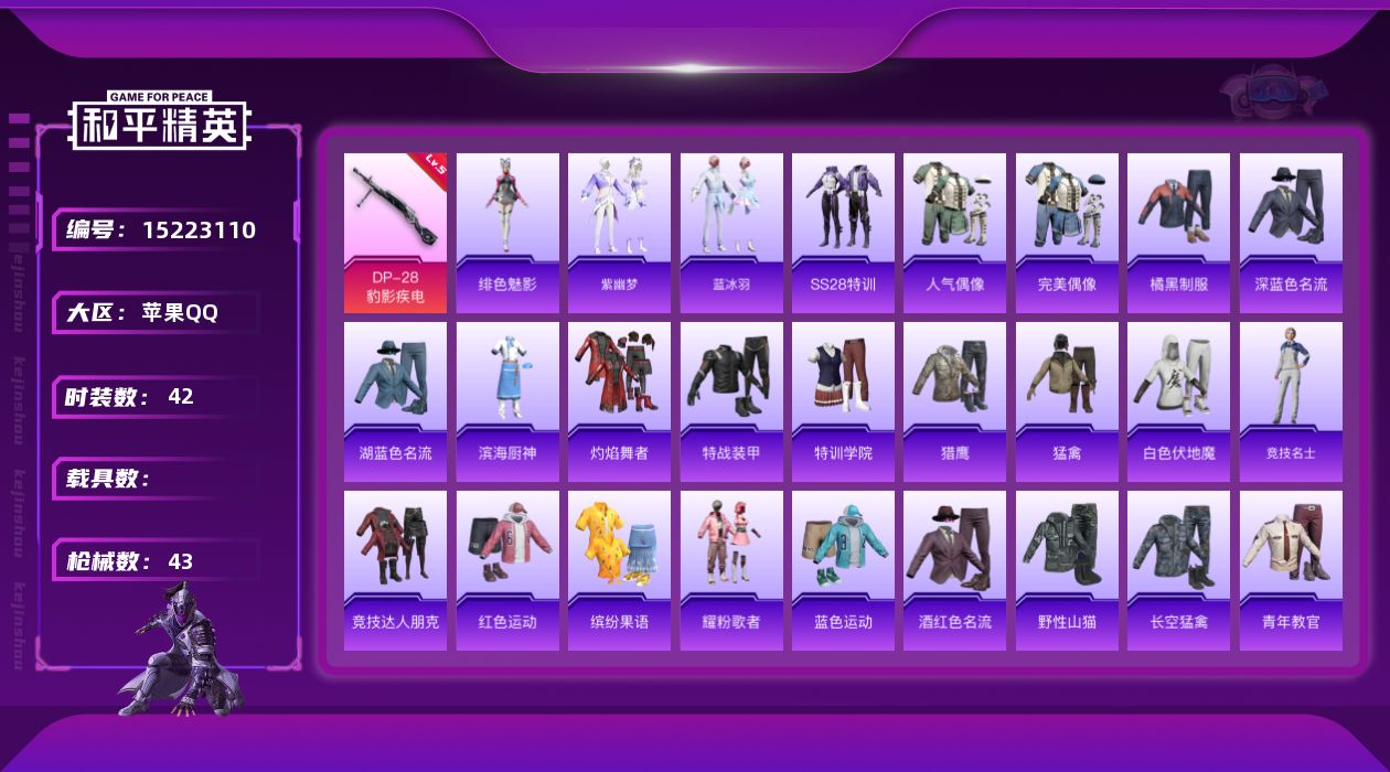[15223110]【店主推荐捡漏号!可直接换绑】地铁满天赋 苹果 手Q-0粉装-1特效枪-0载具-1粉色飞行器-10284热力值-2王牌印记-42套装-43枪皮 【粉色枪皮等级】:DP-28-豹影疾电(五级) 【粉色枪皮】:DP-28-豹影疾电 【粉色降落伞】:炫彩糖果降落伞 【稀有套装】:套装-紫幽梦,套装-蓝冰羽,角色-绯色魅影,套装-炫彩糖果 【稀有枪皮】:AKM-龙的传人,G36C-星穹咏叹调,UZI-天降萌叽,Kar98K-彩虹符号,AMR-喜羊羊与灰太狼,DBS-幻彩电音,MG3-幻世战舞者,R45-幻彩电音,短管霰弹-星穹咏叹调 【其他套装】:套装-SS28特训,套装-人气偶像,套装-完美偶像,套装-橘黑制服,套装-深蓝色名流,套装-湖蓝色名流,套装-滨海厨神,套装-灼焰舞者,套装-特战装甲,套装-特训学院,套装-猎鹰,套装-猛禽,套装-白色伏地魔,套装-竞技名士,套装-竞技达人朋克,套装-红色运动,套装-缤纷果语,套装-耀粉歌者,套装-蓝色运动,套装-酒红色名流,套装-野性山猫,套装-长空猛禽,套装-青年教官,套装-青涩时光,套装-黄色伏地魔,套装-黄色名流,套装-黄色运动,套装-黑色伏地魔 【营地ID】:980531851
