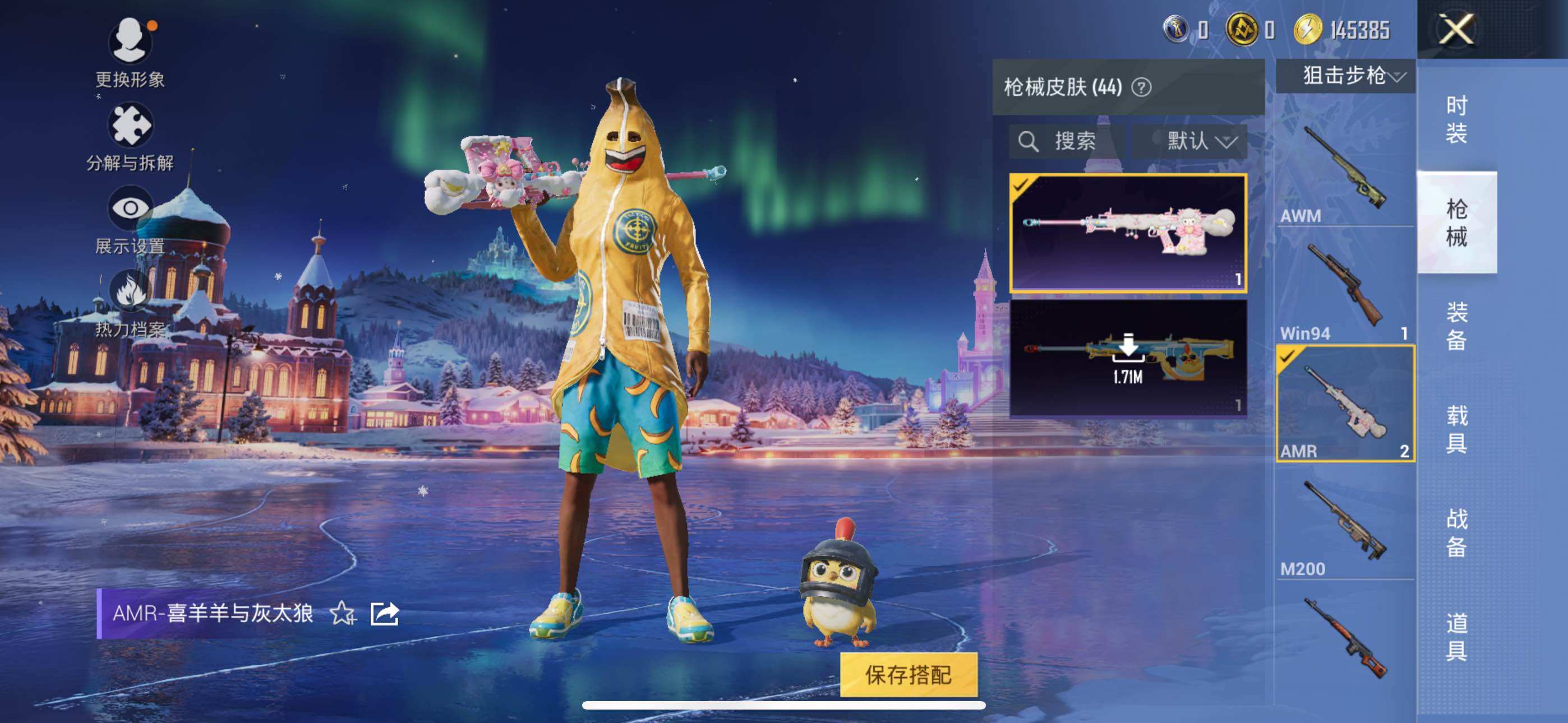 【稀有枪皮】:AKM-龙的传人,G36C-星穹咏叹调,UZI-天降萌叽,Kar98K-彩虹符号,AMR-喜羊羊与灰太狼,DBS-幻彩电音,MG3-幻世战舞者,R45-幻彩电音,短管霰弹-星穹咏叹调