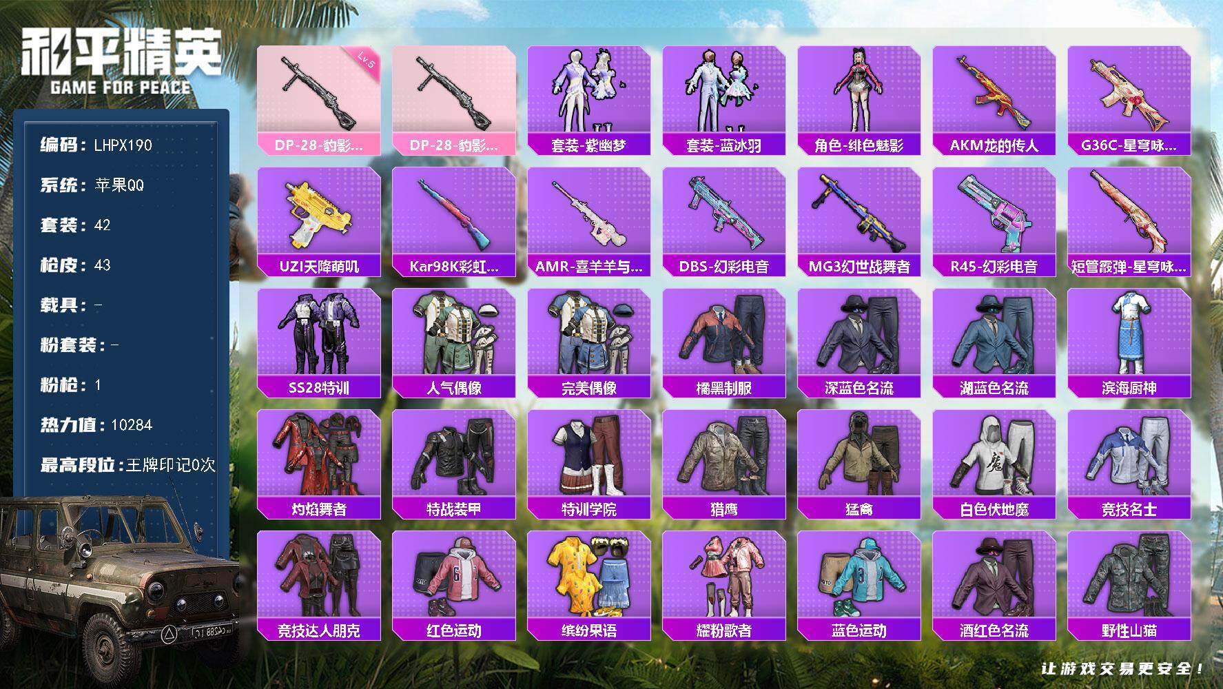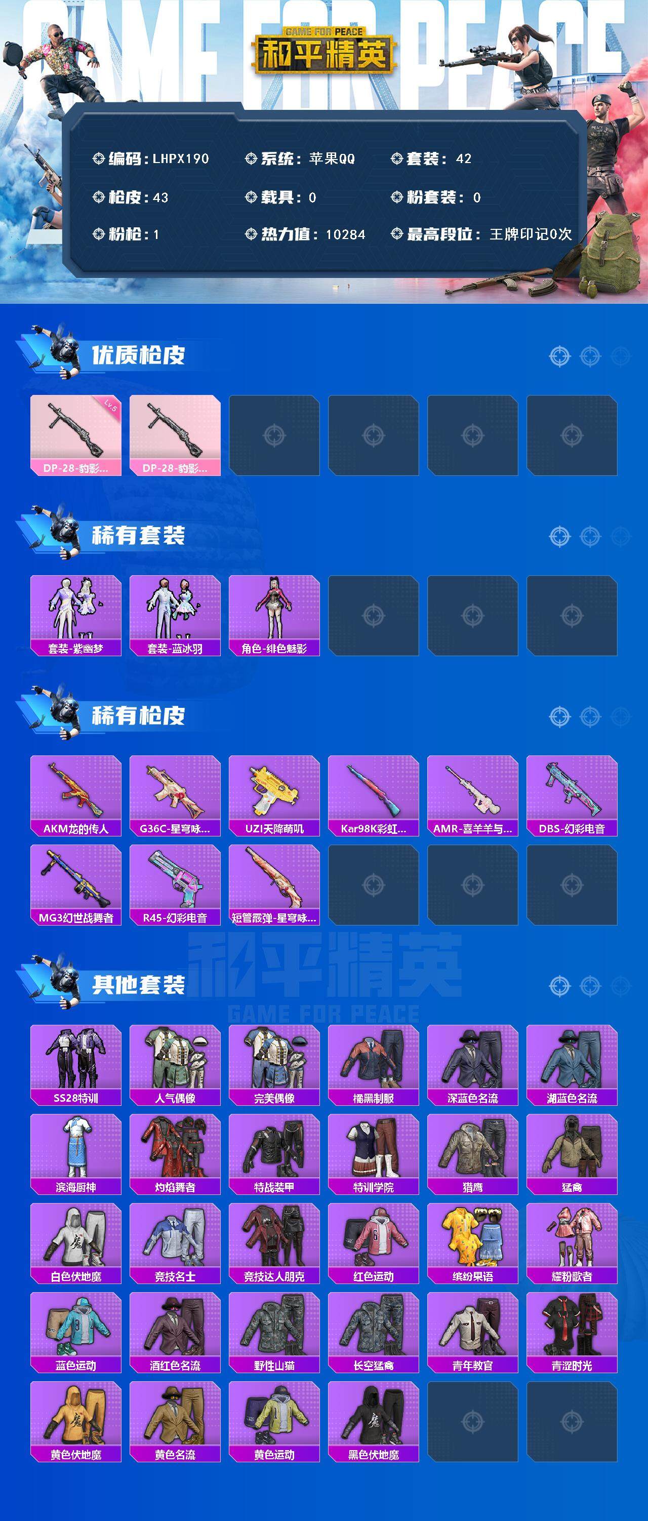 [15223110]【店主推荐捡漏号!可直接换绑】地铁满天赋 苹果 手Q-0粉装-1特效枪-0载具-1粉色飞行器-10284热力值-2王牌印记-42套装-43枪皮