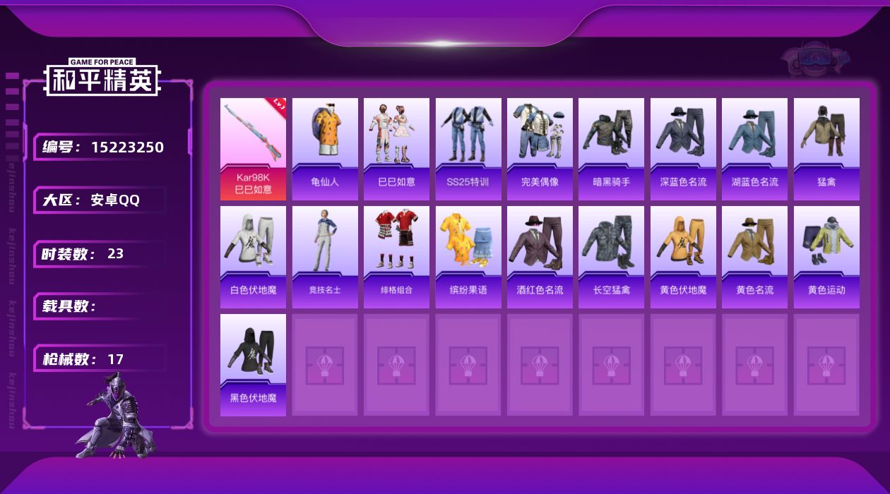 [15223250]【店主推荐捡漏号!可直接换绑】地铁满天赋 安卓 手Q-0粉装-1特效枪-0载具-0粉色飞行器-4421热力值-0王牌印记-23套装-17枪皮 【热门品类】:套装-龟仙人 【粉色枪皮等级】:Kar98K-巳巳如意(一级) 【粉色枪皮】:Kar98K-巳巳如意 【稀有套装】:套装-龟仙人,套装-巳巳如意 【稀有枪皮】:AKM-龙的传人,QBZ-彩虹符号,AC-VAL-天降萌叽,UZI-天降萌叽,Vector-生命誓言,汤姆逊-天降萌叽,P90-巳巳如意,S12K-玩趣呆呆,M249-彩虹符号,MG3-幻世战舞者,破片手榴弹-巳巳如意 【其他套装】:套装-SS25特训,套装-完美偶像,套装-暗黑骑手,套装-深蓝色名流,套装-湖蓝色名流,套装-猛禽,套装-白色伏地魔,套装-竞技名士,套装-绯格组合,套装-缤纷果语,套装-酒红色名流,套装-长空猛禽,套装-黄色伏地魔,套装-黄色名流,套装-黄色运动,套装-黑色伏地魔,套装-龟仙人 【营地ID】:1035248002