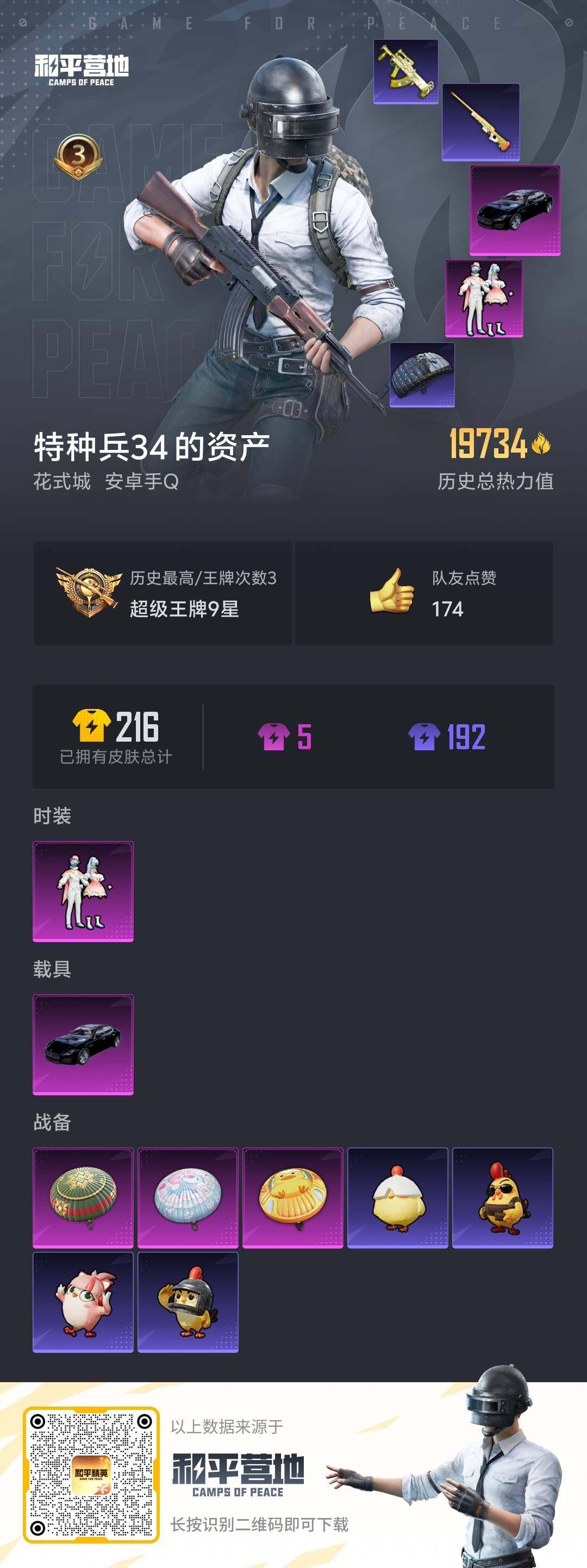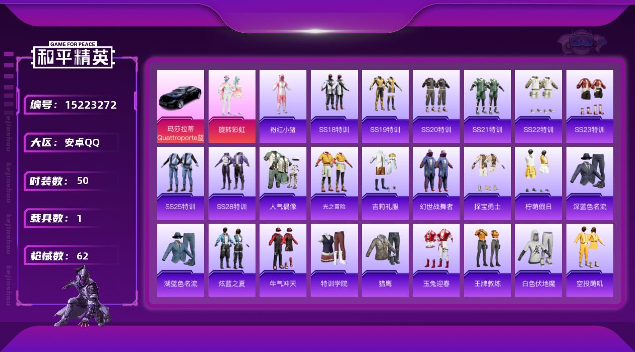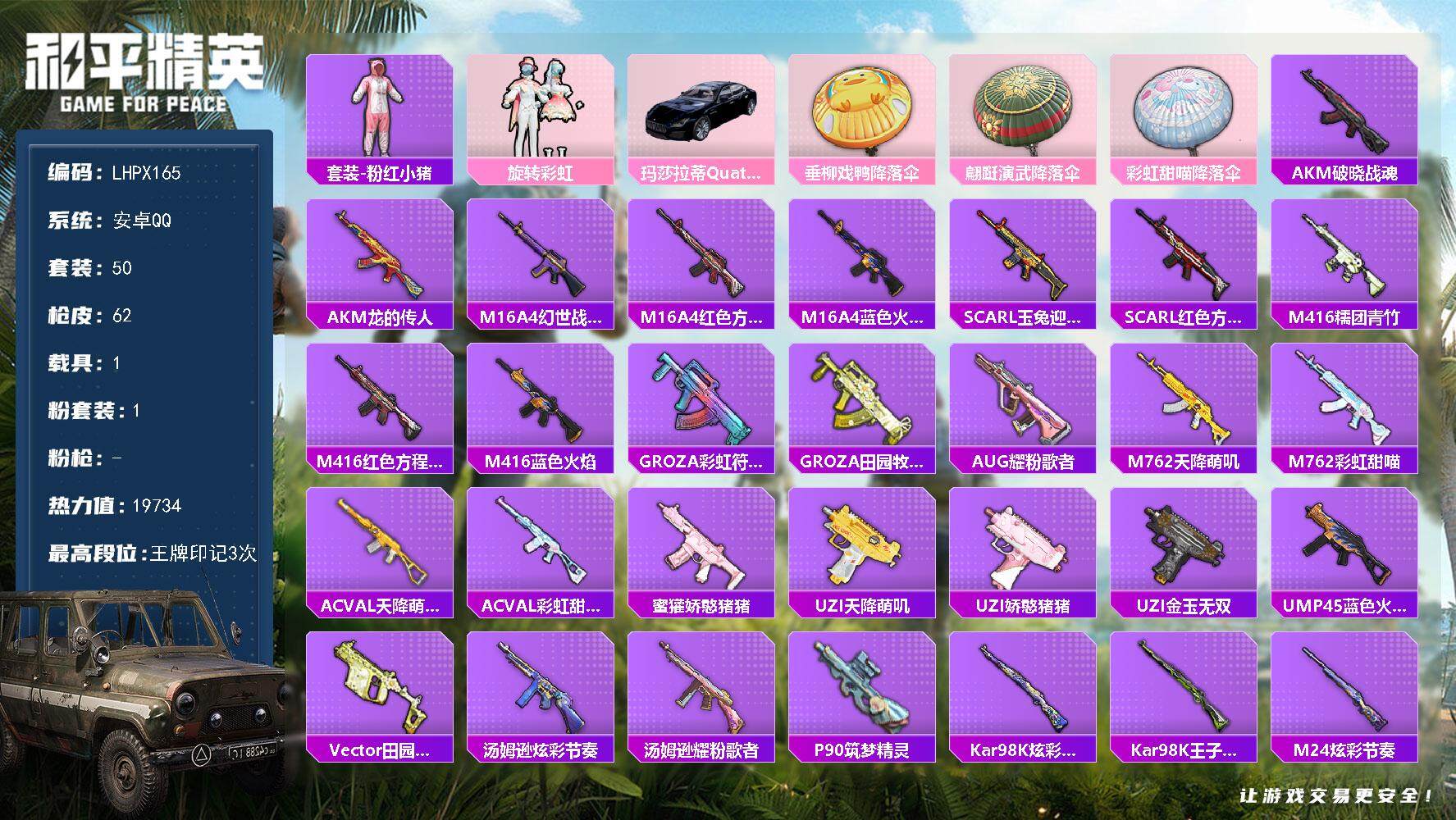[15223272]【店主推荐捡漏号!可直接换绑】安卓 手Q-1粉装-0特效枪-1载具-0粉色飞行器-19734热力值-3王牌印记-50套装-62枪皮