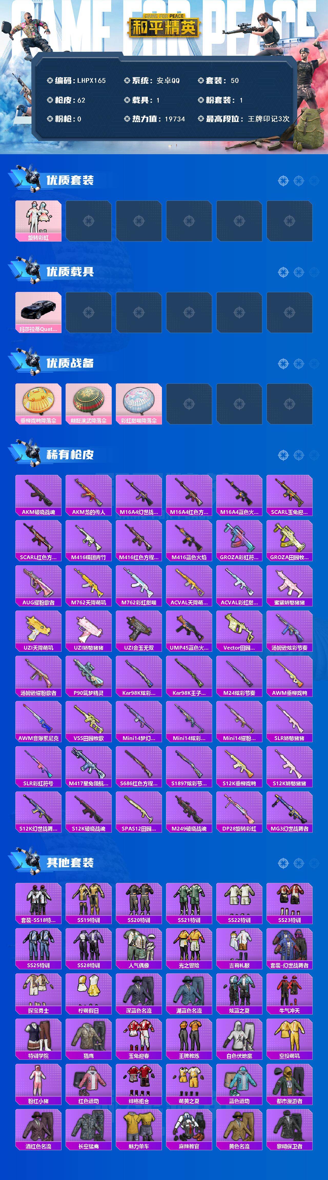 [15223272]【店主推荐捡漏号!可直接换绑】安卓 手Q-1粉装-0特效枪-1载具-0粉色飞行器-19734热力值-3王牌印记-50套装-62枪皮 【热门品类】:套装-粉红小猪 【粉色套装】:粉装-旋转彩虹 【粉色载具】:玛莎拉蒂Quattroporte(夜幕蓝) 【粉色降落伞】:垂柳戏鸭降落伞,翩跹演武降落伞,彩虹甜喵降落伞 【稀有枪皮】:AKM-破晓战魂,AKM-龙的传人,M16A4-幻世战舞者,M16A4-红色方程式,M16A4-蓝色火焰,SCAR-L-玉兔迎春,SCAR-L-红色方程式,M416-糯团青竹,M416-红色方程式,M416-蓝色火焰,GROZA-彩虹符号,GROZA-田园牧歌,AUG-耀粉歌者,M762-天降萌叽,M762-彩虹甜喵,AC-VAL-天降萌叽,AC-VAL-彩虹甜喵,蜜獾-娇憨猪猪,UZI-天降萌叽,UZI-娇憨猪猪,UZI-金玉无双,UMP45-蓝色火焰,Vector-田园牧歌,汤姆逊-炫彩节奏,汤姆逊-耀粉歌者,P90-筑梦精灵,Kar98K-炫彩节奏,Kar98K-王子的夏天,M24-炫彩节奏,AWM-垂柳戏鸭,AWM-音爆索尼克,VSS-田园牧歌,Mini14-梦幻火箭,Mini14-炫彩节奏,Mini14-耀粉歌者,SLR-娇憨猪猪,SLR-彩虹符号,M417-星兔领航员,S686-红色方程式,S1897-炫彩节奏,S12K-破晓战魂,S12K-垂柳戏鸭,S12K-娇憨猪猪,S12K-幻世战舞者,SPAS-12-田园牧歌,M249-破晓战魂,DP-28-旋转彩虹,MG3-幻世战舞者 【其他套装】:套装-SS18特训,套装-SS19特训,套装-SS20特训,套装-SS21特训,套装-SS22特训,套装-SS23特训,套装-SS25特训,套装-SS28特训,套装-人气偶像,套装-光之冒险,套装-吉莉礼服,套装-幻世战舞者,套装-探宝勇士,套装-柠萌假日,套装-深蓝色名流,套装-湖蓝色名流,套装-炫蓝之夏,套装-牛气冲天,套装-特训学院,套装-猎鹰,套装-玉兔迎春,套装-王牌教练,套装-白色伏地魔,套装-空投萌叽,套装-粉红小猪,套装-红色运动,套装-绯格组合,套装-萌黄之夏,套装-蓝色运动,套装-都市漫游者,套装-酒红色名流,套装-长空猛禽,套装-魅力单车,套装-麻辣教官,套装-黄色名流,套装-黎明保卫者,套装-黑色伏地魔,套装-龙的传人