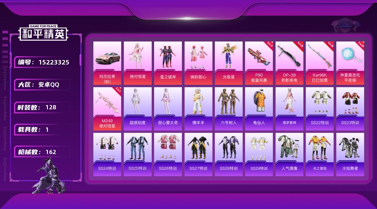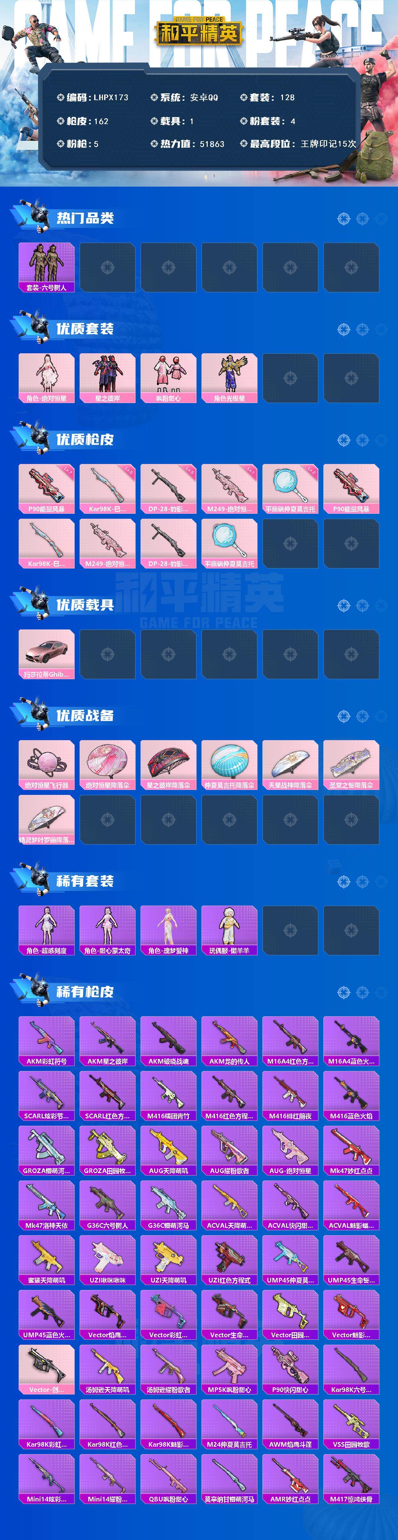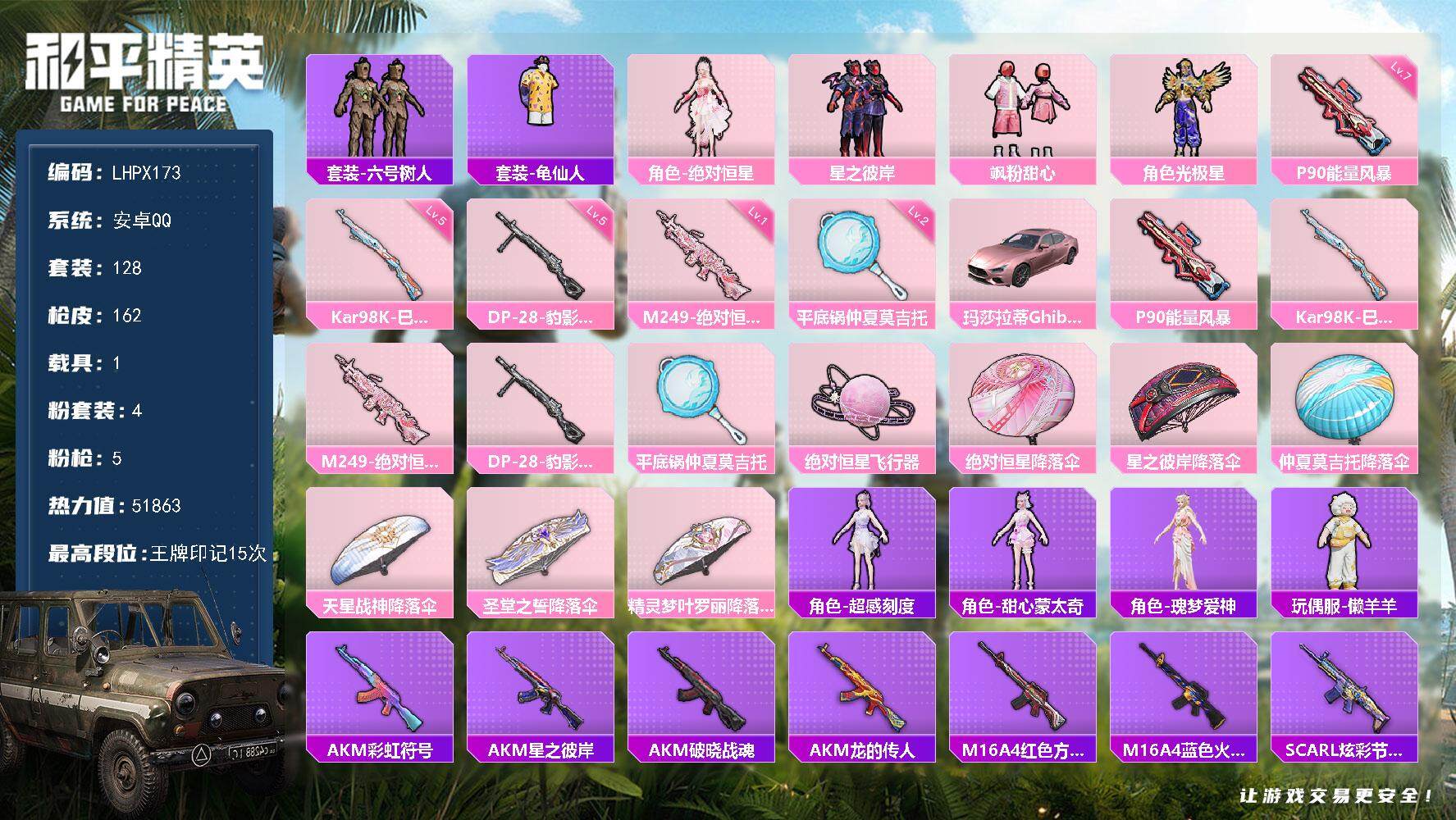 [15223325]【店主推荐捡漏号!可直接换绑】安卓 手Q-4粉装-5特效枪-1载具-3粉色飞行器-51863热力值-15王牌印记-128套装-162枪皮 【热门品类】:套装-六号树人,套装-龟仙人 【粉色套装】:角色-绝对恒星,粉装-星之彼岸,粉装-飒粉甜心,角色-光极星 【粉色枪皮等级】:P90-能量风暴(七级),Kar98K-巳巳如意(五级),M249-绝对恒星(一级),DP-28-豹影疾电(五级),平底锅-仲夏莫吉托(二级) 【粉色载具】:玛莎拉蒂Ghibli(粉) 【粉色枪皮】:P90-能量风暴,Kar98K-巳巳如意,M249-绝对恒星,DP-28-豹影疾电,平底锅-仲夏莫吉托 【粉色飞行器】:绝对恒星飞行器 【粉色降落伞】:绝对恒星降落伞,星之彼岸降落伞,仲夏莫吉托降落伞,天星战神降落伞,圣堂之誓降落伞,精灵梦叶罗丽降落伞,炫彩糖果降落伞 【稀有套装】:套装-龟仙人,角色-超感刻度,角色-甜心蒙太奇,套装-雪国风尚,角色-瑰梦爱神,玩偶服-懒羊羊,套装-炫彩糖果 【稀有枪皮】:AUG-冰晶雪宝,AKM-彩虹符号,AKM-星之彼岸,AKM-破晓战魂,AKM-龙的传人,M16A4-红色方程式,M16A4-蓝色火焰,SCAR-L-炫彩节奏,SCAR-L-红色方程式,M416-糯团青竹,M416-红色方程式,M416-绯红前夜,M416-蓝色火焰,GROZA-懵萌河马,GROZA-田园牧歌,AUG-天降萌叽,AUG-耀粉歌者,AUG-绝对恒星,Mk47-妙红点点,Mk47-洛神天依,G36C-六号树人,G36C-懵萌河马,AC-VAL-天降萌叽,AC-VAL-快闪甜心,AC-VAL-魅影蝠王,蜜獾-天降萌叽,UZI-啾咪啾咪,UZI-天降萌叽,UZI-红色方程式,UMP45-仲夏莫吉托,UMP45-生命誓言,UMP45-蓝色火焰,Vector-焰鹰斗篷,Vector-彩虹符号,Vector-生命誓言,Vector-田园牧歌,Vector-魅影蝠王,Vector-创世·救赎,汤姆逊-天降萌叽,汤姆逊-耀粉歌者,MP5K-飒粉甜心,P90-快闪甜心,Kar98K-六号树人,Kar98K-彩虹符号,Kar98K-红色方程式,Kar98K-魅影蝠王,M24-仲夏莫吉托,AWM-焰鹰斗篷,VSS-田园牧歌,Mini14-炫彩节奏,Mini14-耀粉歌者,QBU-飒粉甜心,莫辛纳甘-懵萌
