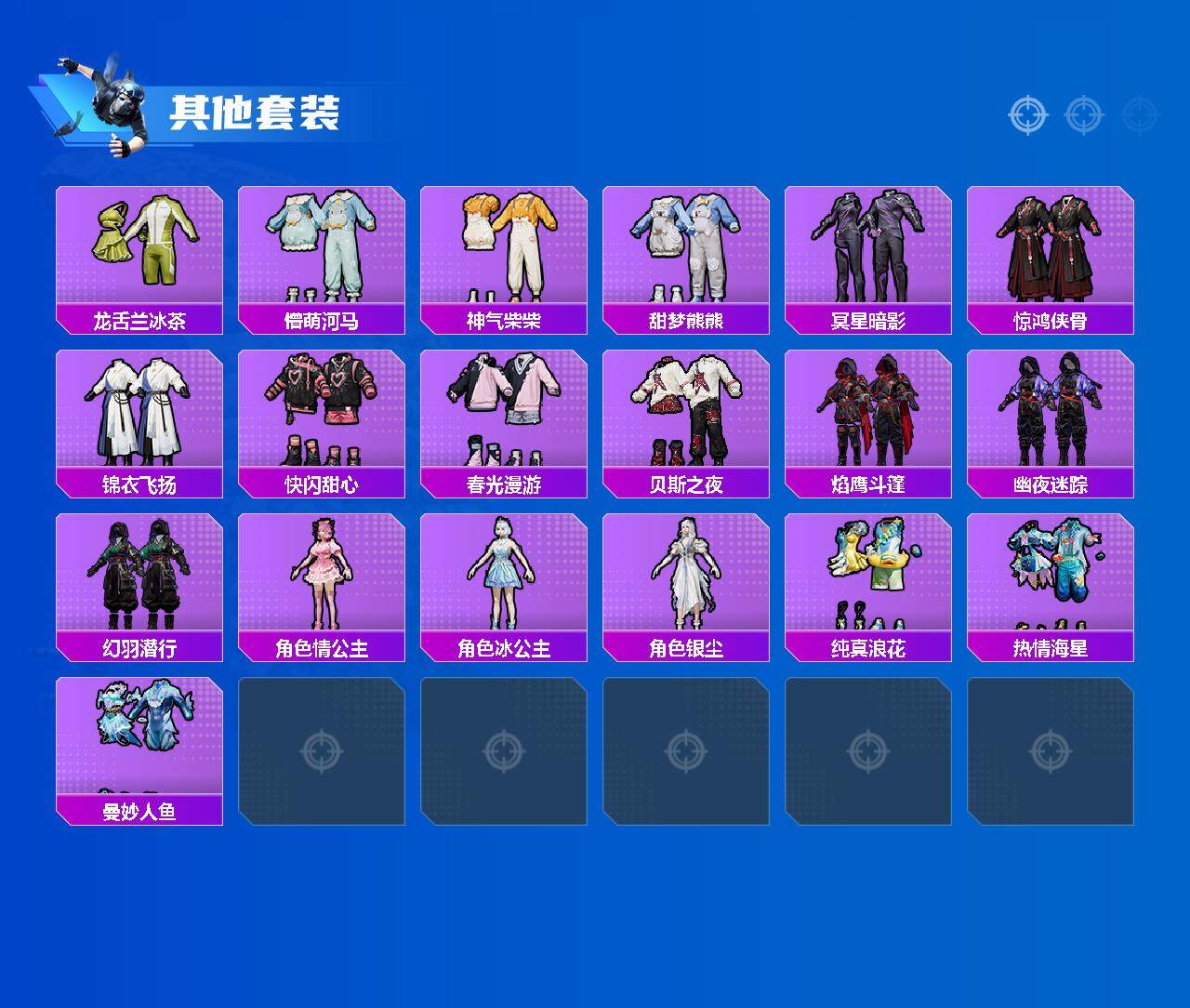 【稀有套装】:套装-龟仙人,角色-超感刻度,角色-甜心蒙太奇,套装-雪国风尚,角色-瑰梦爱神,玩偶服-懒羊羊,套装-炫彩糖果
