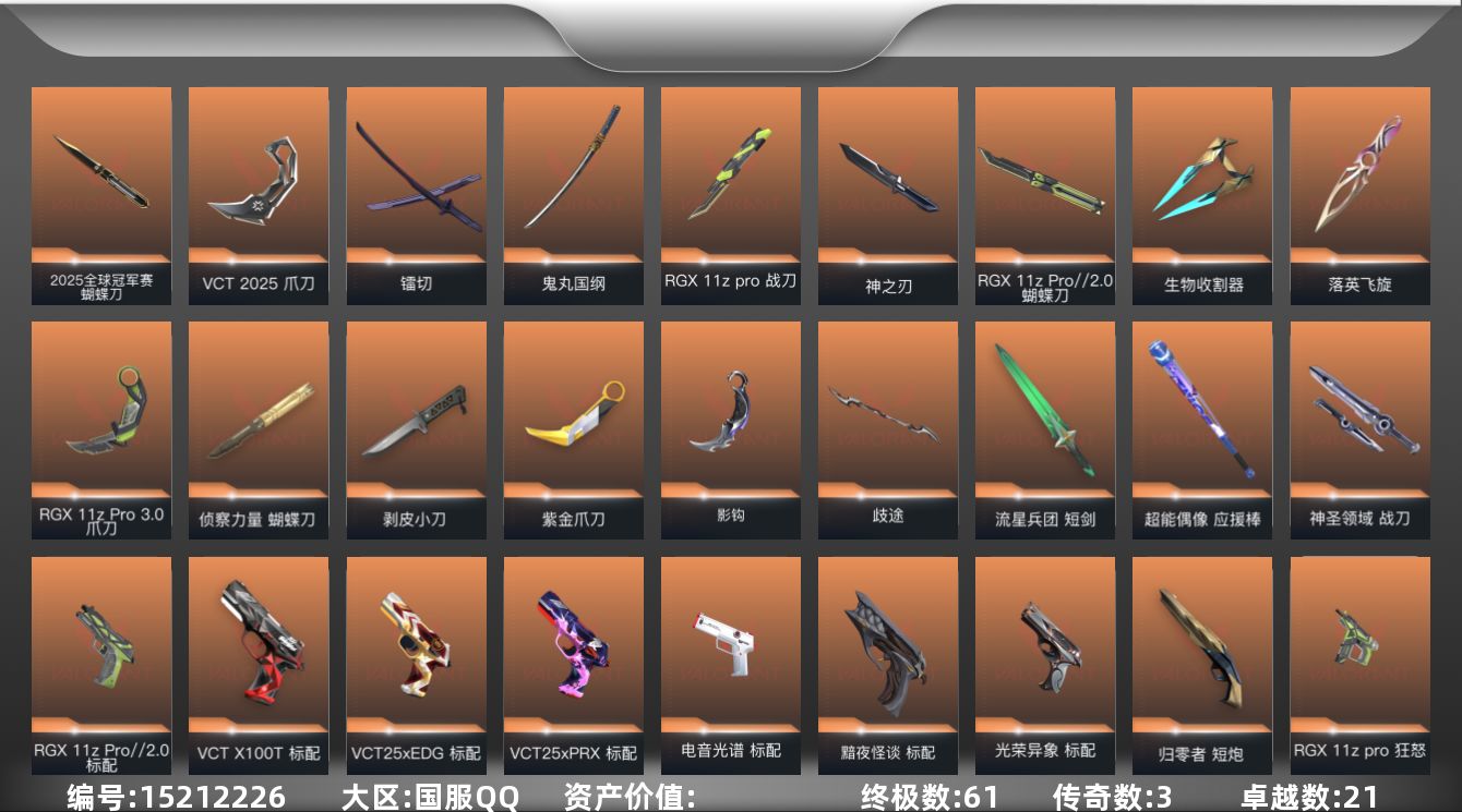 [15212226]【店主推荐捡漏号!可直接换绑】【套装】:2025全球冠军赛套装,光荣异象套装,RGX 11z Pro套装,VCT 2025 赛季套装,RGX 11z Pro//2.0套装,创·纪元套装,离火刃套装,归零者套装,神中神罚套装,离火刃套装 【英雄】:幻棱,炼狱,维斯,暮蝶,钛狐,壹决,铁臂,捷风,雷兹,幽影,不死鸟,贤者,猎枭,蝰蛇,零,芮娜,奇乐,尚勃勒,霓虹,斯凯,夜露,星礈,K/O,海神,盖可,黑梦,钢锁 【近战 武器】:近战武器-2025全球冠军赛 蝴蝶刀,近战武器-影钩,近战武器-光荣异象 歧途,近战武器-RGX 11z Pro 战刀,近战武器-神之刃,近战武器-RGX 11z Pro//2.0 蝴蝶刀,近战武器-侦察力量 蝴蝶刀,近战武器-剥皮小刀,近战武器-VCT 2025 爪刀,近战武器-紫金爪刀,近战武器-RGX 11z Pro//3.0 爪刀,近战武器-离火刃,近战武器-落英飞旋,近战武器-镭切,近战武器-鬼丸国纲,近战武器-流星兵团 短剑,近战武器-超能偶像 应援棒,近战武器-生物收割器,近战武器-神圣领域 战刀,近战武器-阿特拉斯指挥部 甩棍,近战武器-星际猎兵 短剑 【狂徒】:狂徒-艾沃莉的梦之翼,狂徒-2025全球冠军赛,狂徒-2023全球冠军赛,狂徒-归零者,狂徒-混沌序曲,狂徒-塑水宗,狂徒-创·纪元,狂徒-RGX 11z Pro,狂徒-光荣异象,狂徒-堕天遗武,狂徒-掠影,狂徒-盖亚的复仇,狂徒-海洋之星,狂徒-紫阙金琅,狂徒-超能偶像,狂徒-钢轨卫士,狂徒-弧光异彩,狂徒-流星兵团,狂徒-沙尘幻旅,狂徒-诡秘蛇影 【幻影】:幻影-源能者娱乐系统,幻影-洪荒怒焰,幻影-砰砰X特攻队,幻影-RGX 11z Pro//2.0,幻影-末日泡泡,幻影-天界神兵//2.0,幻影-神中神罚,幻影-超限闪存,幻影-合金战车,幻影-神圣领域,幻影-聚合之力,幻影-战术小伙伴 【戍卫】:戍卫-破败军械,戍卫-RGX 11z Pro,戍卫-天界神兵,戍卫-超能偶像,戍卫-钢轨卫士,戍卫-彩梦之城,戍卫-浮光跃金,戍卫-花漾粉红,戍卫-萌彩剪影,戍卫-战术熊与伙伴们,戍卫-月球哨兵,戍卫-折光棱晶 【獠犬】:獠犬-归零者,獠犬-弧光异彩,獠犬-神圣领域,獠犬-采蜜小蜂队,獠犬-胡桃狂想,獠犬-模拟赫兹,獠犬-数码咒术,獠犬-战术小伙伴 【冥驹】:冥驹-归零
