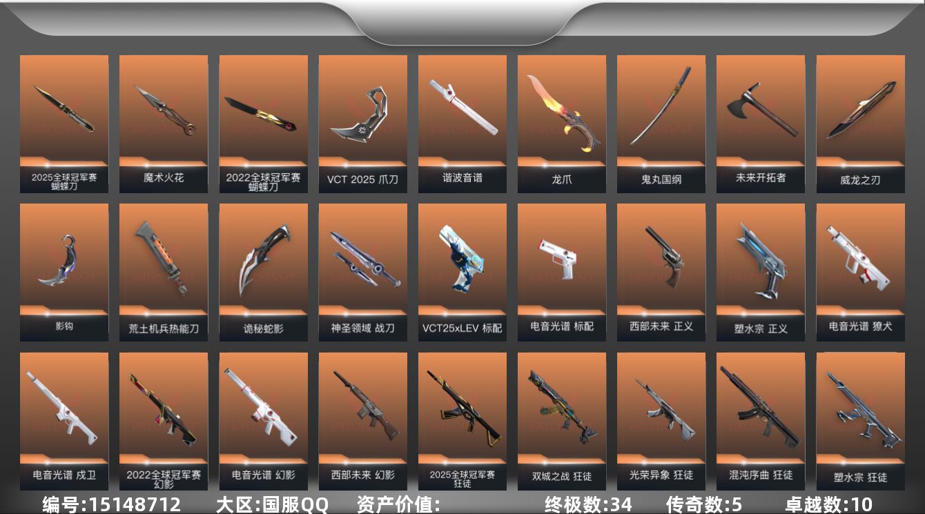 [15148712]可二次【店主推荐捡漏号!可直接换绑】【套装】:2025全球冠军赛套装,2022全球冠军赛套装,上古龙炎套装,电音光谱套装,VCT 2025 赛季套装,西部未来套装,般若假面//2.0套装 【英雄】:幻棱,炼狱,维斯,暮蝶,钛狐,壹决,铁臂,捷风,雷兹,幽影,不死鸟,贤者,猎枭,蝰蛇,零,芮娜,奇乐,尚勃勒,霓虹,斯凯,夜露,星礈,K/O,海神,盖可,黑梦,钢锁 【近战 武器】:近战武器-2025全球冠军赛 蝴蝶刀,近战武器-2022全球冠军赛 蝴蝶刀,近战武器-魔术火花,近战武器-影钩,近战武器-谐波音谱,近战武器-VCT 2025 爪刀,近战武器-威龙之刃,近战武器-鬼丸国纲,近战武器-未来开拓者,近战武器-龙爪,近战武器-荒土机兵 热能刀,近战武器-诡秘蛇影 军刀,近战武器-神圣领域 战刀,近战武器-日耀风暴 遗器,近战武器-阿特拉斯指挥部 甩棍,近战武器-星际猎兵 短剑,近战武器-魔术火花 【狂徒】:狂徒-上古龙炎,狂徒-2025全球冠军赛,狂徒-洪荒怒焰,狂徒-混沌序曲,狂徒-双城之战,狂徒-塑水宗,狂徒-光荣异象,狂徒-般若假面//2.0,狂徒-掠影,狂徒-盖亚的复仇,狂徒-紫阙金琅,狂徒-荒土机兵,狂徒-诡秘蛇影 【幻影】:幻影-2022全球冠军赛,幻影-西部未来,幻影-电音光谱,幻影-侦察力量,幻影-神圣领域,幻影-纳米打击,幻影-末日之翼,幻影-西部未来,幻影-电音光谱 【戍卫】:戍卫-电音光谱,戍卫-逆冲蛮牛,戍卫-月球哨兵,戍卫-折光棱晶,戍卫-电音光谱 【獠犬】:獠犬-电音光谱,獠犬-般若假面//2.0,獠犬-日冕雄师,獠犬-神圣领域,獠犬-逆冲蛮牛,獠犬-电音光谱 【冥驹】:冥驹-上古龙炎,冥驹-荒土机兵,冥驹-星云暗涌 【飞将】:飞将-西部未来,飞将-末日之翼 【莽侠】:莽侠-诡秘蛇影,莽侠-月球哨兵 【战神】:战神-般若假面//2.0,战神-离子武器//2.0,战神-神圣领域 【奥丁】:奥丁-西部未来,奥丁-纳米打击,奥丁-末日之翼 【判官】:判官-上古龙炎,判官-诡秘蛇影,判官-纳米打击x 【雄鹿】:雄鹿-逆冲蛮牛,雄鹿-月球哨兵 【骇灵】:骇灵-荒土机兵,骇灵-无限竞技,骇灵-星云暗涌 【蜂刺】:蜂刺-星云暗涌,蜂刺-折光棱晶 【标配】:标配-电音光谱,标配-荒土机兵,标配-折光棱晶,标配-电音光谱 【VCT手枪】:标配-VCT25