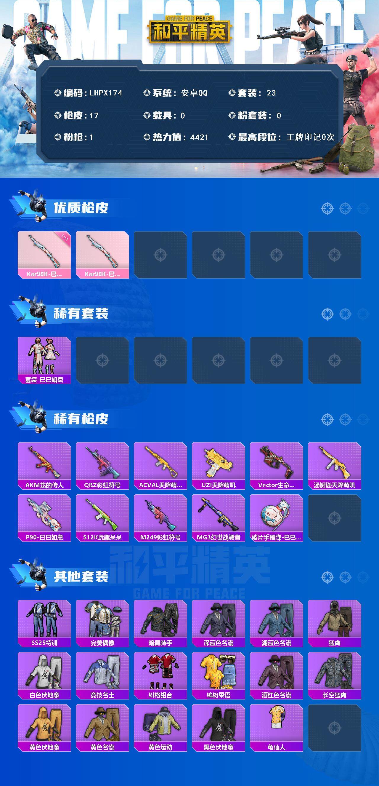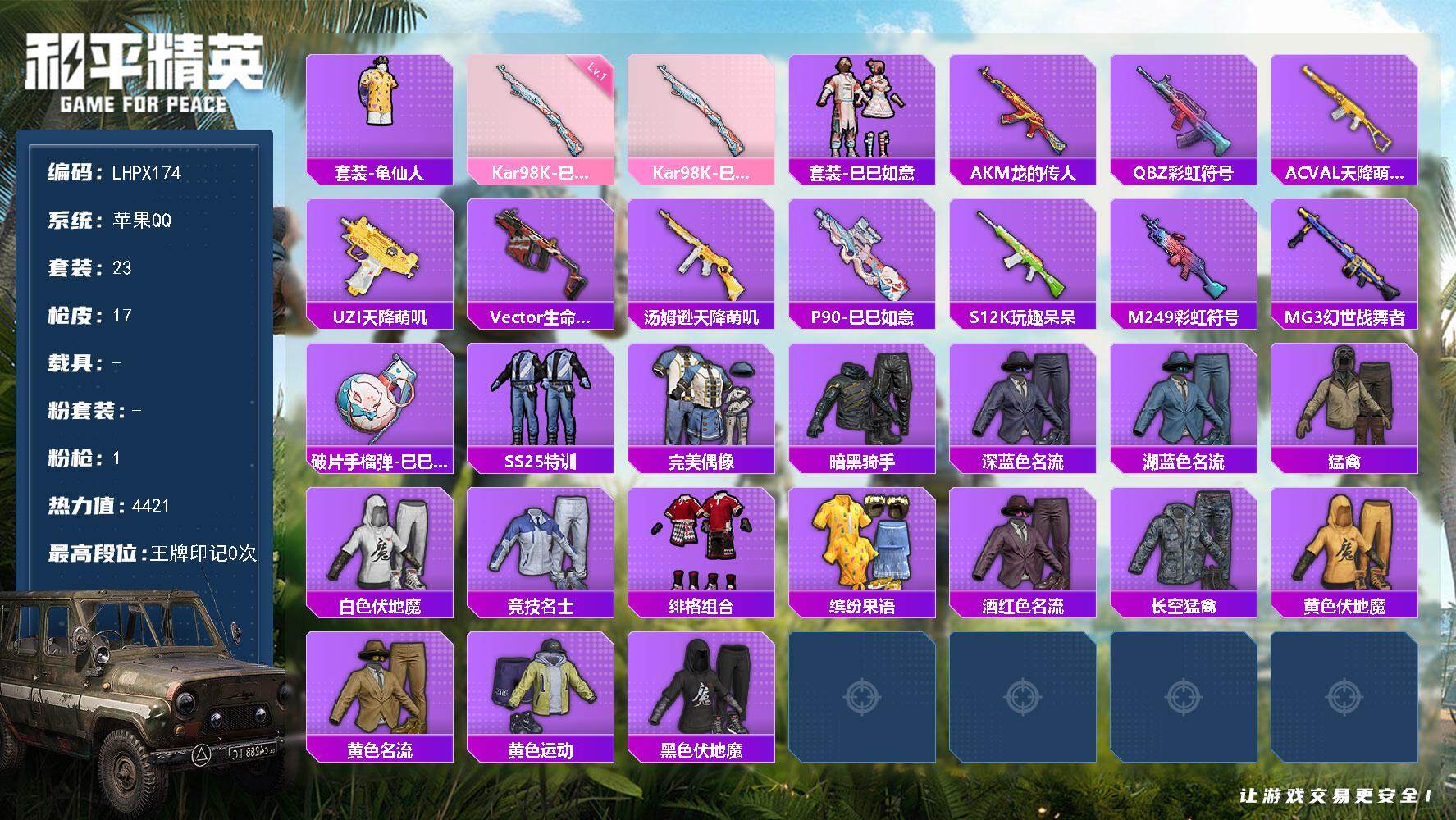 [15225054]【店主推荐捡漏号!可直接换绑】地铁满天赋 苹果 手Q-0粉装-1特效枪-0载具-0粉色飞行器-4421热力值-0王牌印记-23套装-17枪皮 【热门品类】:套装-龟仙人 【粉色枪皮等级】:Kar98K-巳巳如意(一级) 【粉色枪皮】:Kar98K-巳巳如意 【稀有套装】:套装-龟仙人,套装-巳巳如意 【稀有枪皮】:AKM-龙的传人,QBZ-彩虹符号,AC-VAL-天降萌叽,UZI-天降萌叽,Vector-生命誓言,汤姆逊-天降萌叽,P90-巳巳如意,S12K-玩趣呆呆,M249-彩虹符号,MG3-幻世战舞者,破片手榴弹-巳巳如意 【其他套装】:套装-SS25特训,套装-完美偶像,套装-暗黑骑手,套装-深蓝色名流,套装-湖蓝色名流,套装-猛禽,套装-白色伏地魔,套装-竞技名士,套装-绯格组合,套装-缤纷果语,套装-酒红色名流,套装-长空猛禽,套装-黄色伏地魔,套装-黄色名流,套装-黄色运动,套装-黑色伏地魔,套装-龟仙人 【营地ID】:1035248002
