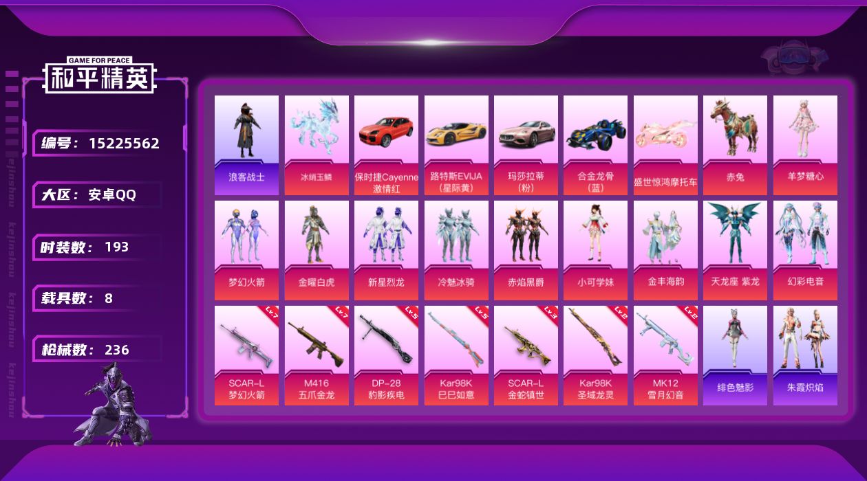 [15225562]【店主推荐捡漏号!可直接换绑】安卓 手Q-10粉装-7特效枪-8载具-9粉色飞行器-8.4w热力值-8王牌印记-193套装-236枪皮【热门品类】:粉装-梦幻火箭,套装-浪漫天命,套装-浪客战士,套装-SS1特训,角色-忠真马岱,套装-粉红小猪,角色-Mark.06【粉色套装】:粉装-金曜白虎,粉装-梦幻火箭,粉装-新星烈龙,粉装-冷魅冰骑,粉装-赤焰黑爵,角色-小可学妹,粉装-金丰海韵,角色-天龙座 紫龙,粉装-幻彩电音,角色-羊梦糖心【粉色枪皮等级】:SCAR-L-梦幻火箭(七级),SCAR-L-金蛇镇世(三级),M416-五爪金龙(七级),汤姆逊-星月云朵(二级MK12-雪月幻音),Kar98K-巳巳如意(五级),Kar98K-圣域龙灵(二级),DP-28-豹影疾电(五级)【粉色载具】:路特斯EVIJA(星际黄),玛莎拉蒂Ghibli(粉),保时捷Cayenne(激情红),合金龙骨(蓝),盛世惊鸿摩托车,僚机-圣域龙宝,赤兔,冰绡玉鳞《粉色枪皮】:SCAR-L-梦幻火箭,SCAR-L-金蛇镇世,M416-五爪金龙,Kar98K-巳巳如意,Kar98K-圣域龙灵,MK12-雪月幻音,DP-28-豹影疾电【粉色飞行器】:梦幻火箭飞行器,星夜魔法师飞行翼,龙翔九天飞行器,深渊漩涡飞行器,凤舞九天飞行器,万象金身飞行器,圣域金龙飞行器,飞天猪飞行器,灵珠游龙飞行器