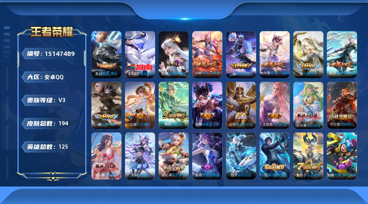 [15147489]安卓Q-V3-永恒钻石IV段位-125英雄-194皮肤-1典藏皮肤-1珍品传说-12传说-53史诗