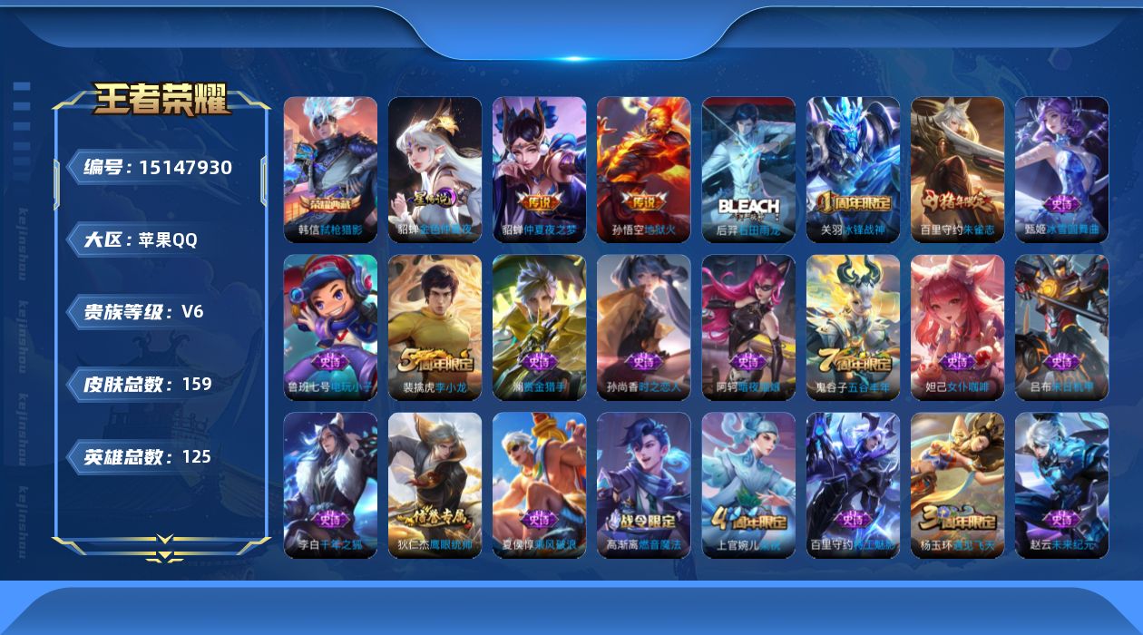 [15147930]【店主推荐捡漏号!可直接换绑】苹果Q-V6-永恒钻石III段位-125英雄-159皮肤-1典藏皮肤-2传说-30史诗