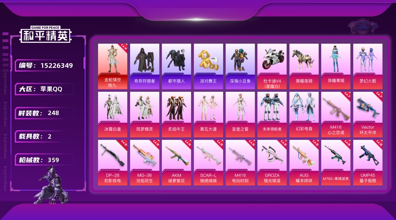 - PX_2109961- 苹果手Q-7王牌印记-5粉装-11特效枪-3载具-56268热力值-97套装-154枪皮-2卓越印记-1传奇印记 【5粉装】,星穹咏叹调,雪月幻音,狂魇小丑,千金淑猫,旋转彩虹 【11特效枪】AKM-幽焰骑士-3级 M416-灵猫魔法师-3级 M416-电玩时刻-5级 AUG-超新星-7级 Kar98K-巳巳如意-1级 Mk14-精灵梦叶罗丽-2级 UMP45-量子极限-5