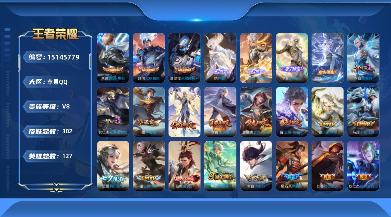 [15145779]【店主推荐捡漏号!可直接换绑】苹果Q-V8-最强王者段位-127英雄-302皮肤-3典藏皮肤-3无双-1珍品传说-3星元-21传说-87史诗
