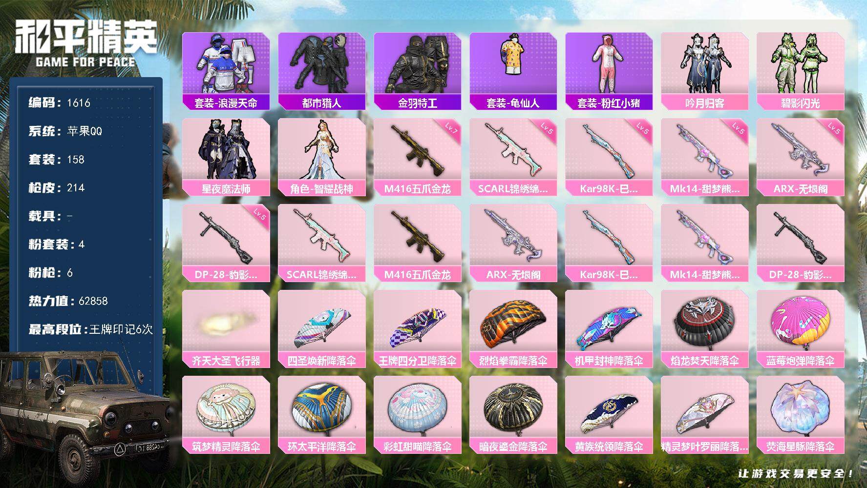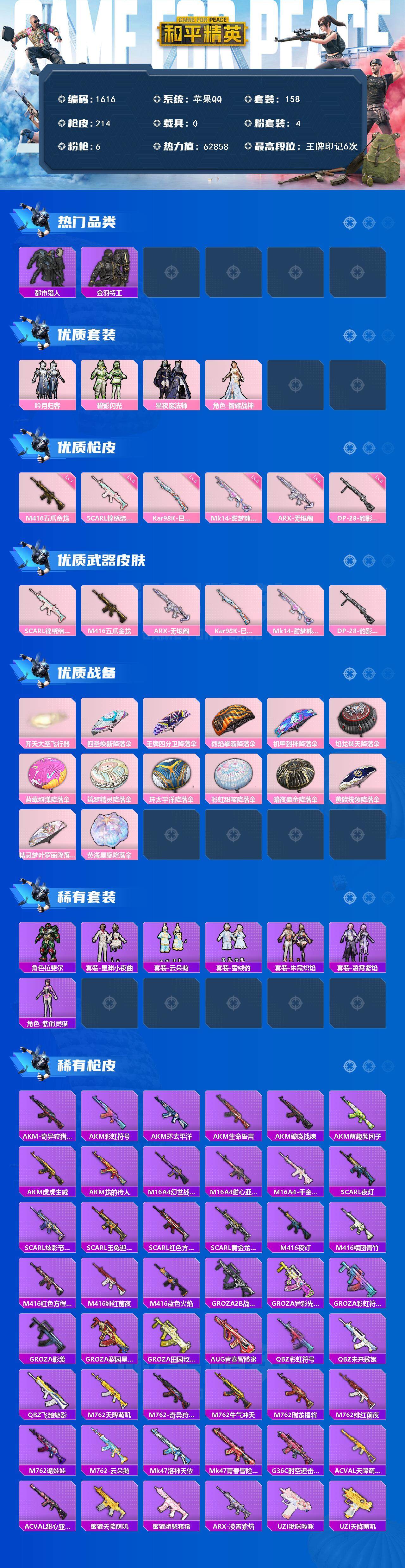 [14451456]【1616】苹果 手Q-4粉装-6特效枪-0载具-1粉色飞行器-62858热力值-6王牌印记-158套装-214枪皮 【热门品类】:套装-浪漫天命,套装-都市猎人,套装-金羽特工,套装-龟仙人,套装-粉红小猪 【粉色套装】:粉装-吟月归客,粉装-碧影闪光,粉装-星夜魔法师,角色-智耀战神 【粉色枪皮等级】:SCAR-L-锦绣绵绵(五级),M416-五爪金龙(七级),ARX-无垠阁(五级),Kar98K-巳巳如意(五级),Mk14-甜梦熊击(五级),DP-28-豹影疾电(五级) 【粉色枪皮】:SCAR-L-锦绣绵绵,M416-五爪金龙,ARX-无垠阁,Kar98K-巳巳如意,Mk14-甜梦熊击,DP-28-豹影疾电 【粉色飞行器】:齐天大圣飞行器 【粉色降落伞】:四圣焕新降落伞,王牌四分卫降落伞,烈焰拳霸降落伞,机甲封神降落伞,焰龙焚天降落伞,蓝莓炮弹降落伞,筑梦精灵降落伞,环太平洋降落伞,彩虹甜喵降落伞,暗夜鎏金降落伞,黄族统领降落伞,精灵梦叶罗丽降落伞,荧海星豚降落伞 【稀有套装】:套装-龟仙人,角色-拉斐尔,套装-星渊小夜曲,套装-云朵鹅,套装-雪绒豹,套装-朱霞炽焰,套装-凌霄紫焰,角色-紫俏灵猫 【稀有枪皮】:AKM-奇异狩猎者,AKM-彩虹符号,AKM-环太平洋,AKM-生命誓言,AKM-破晓战魂,AKM-萌趣颜团子,AKM-虎虎生威,AKM-龙的传人,M16A4-幻世战舞者,M16A4-甜心亚梦,M16A4-千金淑猫,SCAR-L-夜灯,SCAR-L-炫彩节奏,SCAR-L-玉兔迎春,SCAR-L-红色方程式,SCAR-L-黄金龙骨,M416-夜灯,M416-糯团青竹,M416-红色方程式,M416-绯红前夜,M416-蓝色火焰,GROZA-2B战斗服款,GROZA-异彩先驱,GROZA-彩虹符号,GROZA-影袭,GROZA-梨园星光,GROZA-田园牧歌,AUG-青春冒险家,QBZ-彩虹符号,QBZ-未来歌姬,QBZ-飞驰魅影,M762-天降萌叽,M762-奇异狩猎者,M762-牛气冲天,M762-瑞龙福将,M762-绯红前夜,M762-诡娃娃,M762-云朵鹅,Mk47-洛神天依,Mk47-青春冒险家,G36C-时空追击者,AC-VAL-天降萌叽,AC-VAL-甜心亚梦,蜜獾-天降萌叽,蜜獾-娇憨猪猪,ARX-凌霄紫焰,UZI-啾咪啾咪,UZI-