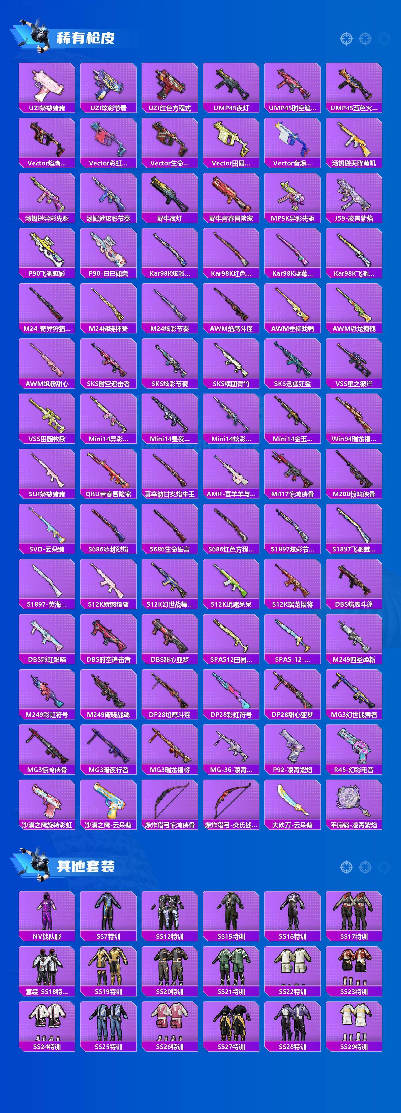 【稀有枪皮】:AKM-奇异狩猎者,AKM-彩虹符号,AKM-环太平洋,AKM-生命誓言,AKM-破晓战魂,AKM-萌趣颜团子,AKM-虎虎生威,AKM-龙的传人,M16A4-幻世战舞者,M16A4-甜心亚梦,M16A4-千金淑猫,SCAR-L-夜灯,SCAR-L-炫彩节奏,SCAR-L-玉兔迎春,SCAR-L-红色方程式,SCAR-L-黄金龙骨,M416-夜灯,M416-糯团青竹,M416-红色方程式,M416-绯红前夜,M416-蓝色火焰,GROZA-2B战斗服款,GROZA-异彩先驱,GROZA-彩虹符号,GROZA-影袭,GROZA-梨园星光,GROZA-田园牧歌,AUG-青春冒险家,QBZ-彩虹符号,QBZ-未来歌姬,QBZ-飞驰魅影,M762-天降萌叽,M762-奇异狩猎者,M762-牛气冲天,M762-瑞龙福将,M762-绯红前夜,M762-诡娃娃,M762-云朵鹅,Mk47-洛神天依,Mk47-青春冒险家,G36C-时空追击者,AC-VAL-天降萌叽,AC-VAL-甜心亚梦,蜜獾-天降萌叽,蜜獾-娇憨猪猪,ARX-凌霄紫焰,UZI-啾咪啾咪,UZI-