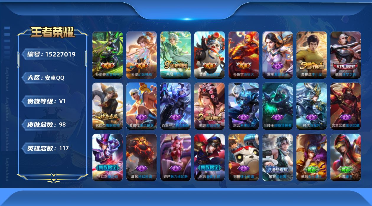 [15227019]暑期末清货/特价急出/永久包赔安卓Q-V0-永恒钻石III段位-116英雄-98皮肤-5传说-17史诗