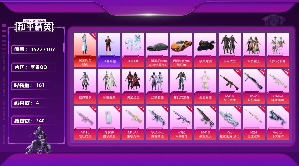 [15227107]【店主推荐捡漏号!可直接换绑】苹果 手Q-1神装-9粉装-13特效枪-4载具-6粉色飞行器-82580热力值-15王牌印记-161套装-240枪皮【红色神装等级】:魔童闹海-敖丙(一级)【红色角色神装】:魔童闹海-敖丙【热门品类】:套装-S1赛事,角色-军刀雅典娜,套装-SS1特训,旭日初心兜帽大衣,套装-龟仙人,套装-粉红小猪,角色-Mark.06【粉色套装】:粉装-未来战士,粉装-华贵君王,粉装-幻彩马卡龙,粉装-银刃赛罗,粉装-冰霜白皇,粉装-炙焰红王,粉装-幻情紫藤,角色-复仇流浪者,角色-烟云彩露【粉色枪皮等级】:M16A4-垂柳戏鸭(四级),SCAR-L-青春物语(四级),SCAR-L-锦绣绵绵(五级),M416-五爪金龙(七级),M416-电玩时刻(五级),M416-墨龙九天(三级),M762-电糖天使(四级),Vector-环太平洋(一级),P90-魔童闹海 敖丙(二级),M24-镜域双华(二级),DP-28-豹影疾电(五级),烟雾弹-甜梦果泡(五级)【粉色载具】:兰博基尼Estoque(银翼灰),迈凯伦570S(旭日黄),疾风龙骑,冰绡玉鳞【粉色枪皮】:M16A4-垂柳戏鸭,SCAR-L-青春物语,SCAR-L-锦绣绵绵,M416-五爪金龙,M416-电玩时刻,M416-墨龙九天,M762-电糖天使,Vector-环太平洋,P90-魔童闹海 敖丙,Kar98K-暗翼战神,M24-镜域双华,DP-28-豹影疾电,烟雾弹-甜梦果泡【粉色飞行器】:炫紫旋律飞行器,潮汐统领飞行器,镜域双华-灵镜之阶,龙翔九天飞行器,灵珠游龙飞行器