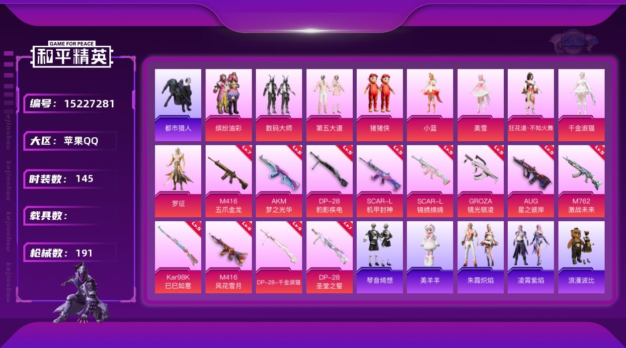 [15227281]q钱包未注销不影响使用 苹果 手Q-9粉装-12特效枪-0载具-2粉色飞行器-66749热力值-13王牌印记-145套装-191枪皮