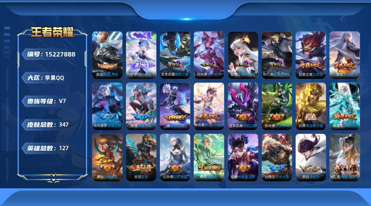 [15227888]【店主推荐捡漏号!可直接换绑】/打野45段/发育路36段,苹果Q-V7-最强王者段位-127英雄-347皮肤-1典藏皮肤-1无双-24传说-104史诗
