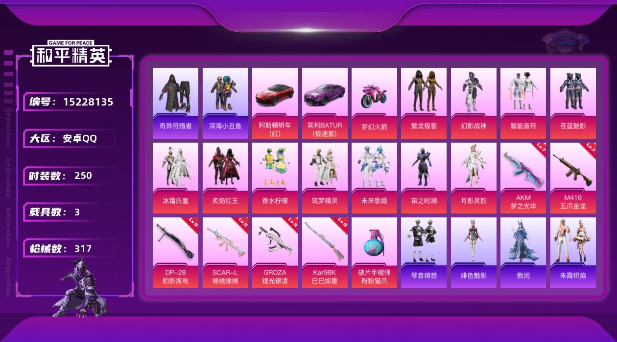 [15228135]【店主推荐捡漏号!可直接换绑】/素材身法号 安卓 手Q-11粉装-7特效枪-3载具-5粉色飞行器-10.7w热力值-13王牌印记-250套装-317枪皮【热门品类】:粉装-繁龙极客,套装-浪漫天命,套装-深海小丑鱼,套装-奇异狩猎者,套装-龟仙人,套装-粉红小猪,角色-Mark.06【粉色载具】:阿斯顿马丁DBS(红),宾利BATUR(极速紫),双人摩托-梦幻火箭【粉色套装】:粉装-幻影战神,粉装-智能音符,粉装-苍蓝魅影,粉装-冰霜白皇,粉装-炙焰红王,粉装-香水柠檬,粉装-筑梦精灵,粉装-未来歌姬,角色-宙之时溯,粉装-繁龙极客,角色-月影灵韵【粉色枪皮等级】:AKM-梦之光华(七级),SCAR-L-锦绣绵绵(五级),M416-五爪金龙(七级),GROZA-镜光银凌(五级),Kar98K-巳巳如意(五级),DP-28-豹影疾电(五级)【粉色飞行器】:梦幻火箭飞行器,童趣迷兔飞行器,绝色倾城飞行器,极意拳锋飞行器