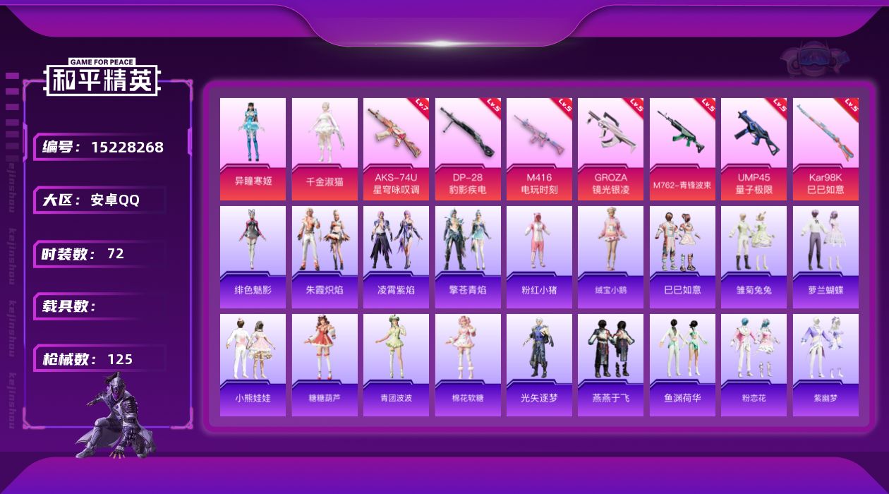 [15228268]【店主推荐捡漏号!可直接换绑】 安卓 手Q-2粉装-7特效枪-4粉色飞行器-3.8w热力值-6王牌印记-72套装-125枪皮【热门品类】:套装-粉红小猪【粉色套装】:角色-千金淑猫,角色-异瞳寒姬【粉色枪皮等级】:M416-电玩时刻(五级),GROZA-镜光银凌(五级),M762-青锋波束(五级),UMP45-量子极限(五级),AKS-74U-星穹咏叹调(七级),Kar98K-巳巳如意(五级),DP-28-豹影疾电(五级)【粉色飞行器】:冠军兔兔飞行器,时光之吻飞行器,时光之誓飞行器