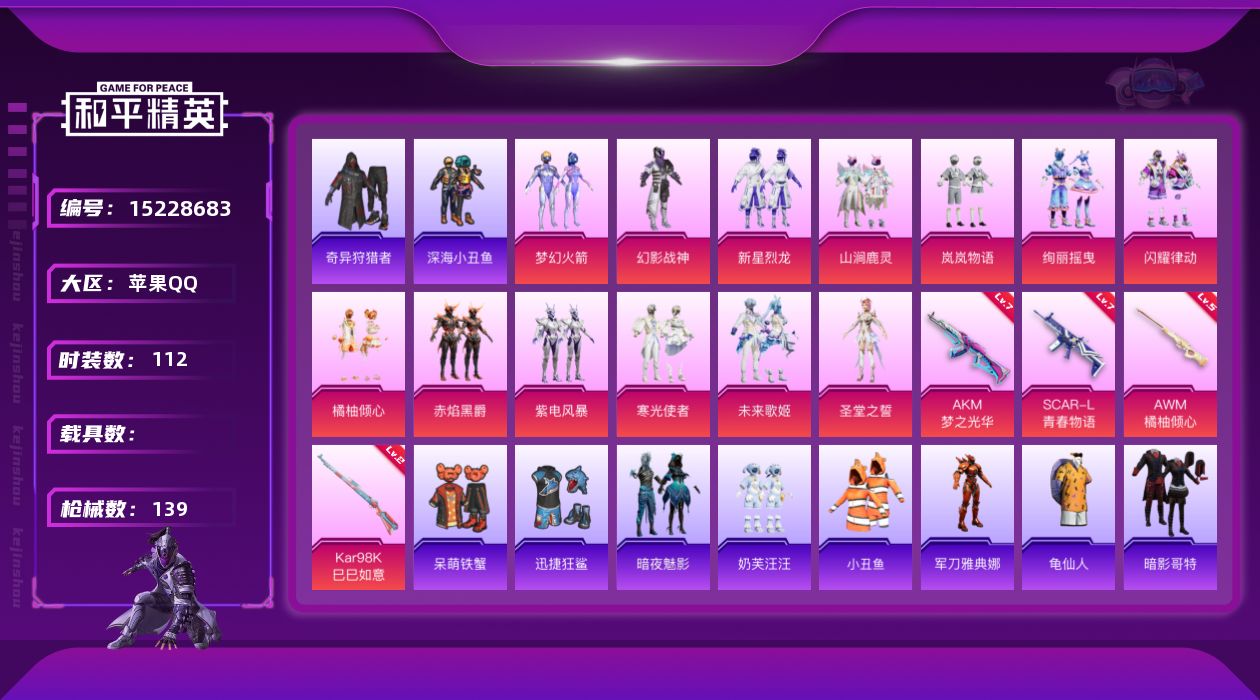 [15228683]【店主推荐捡漏号!可直接换绑】苹果 手Q-13粉装-4特效枪-0载具-1粉色飞行器-50257热力值-7王牌印记-112套装-139枪皮【热门品类】:粉装-梦幻火箭,套装-深海小丑鱼,套装-小丑鱼,套装-奇异狩猎者,角色-军刀雅典娜,套装-龟仙人,套装-暗影哥特,角色-8号机,角色-Mark.06【粉色套装】:粉装-幻影战神,粉装-梦幻火箭,粉装-新星烈龙,粉装-山涧鹿灵,粉装-岚岚物语,粉装-绚丽摇曳,粉装-闪耀律动,粉装-橘柚倾心,粉装-赤焰黑爵,粉装-紫电风暴,粉装-寒光使者,粉装-未来歌姬,角色-圣堂之誓【粉色枪皮等级】:AKM-梦之光华(七级),SCAR-L-青春物语(七级),Kar98K-巳巳如意(二级),AWM-橘柚倾心(五级)【粉色枪皮】:AKM-梦之光华,SCAR-L-青春物语,Kar98K-巳巳如意,AWM-橘柚倾心【粉色飞行器】:星夜魔法师飞行翼