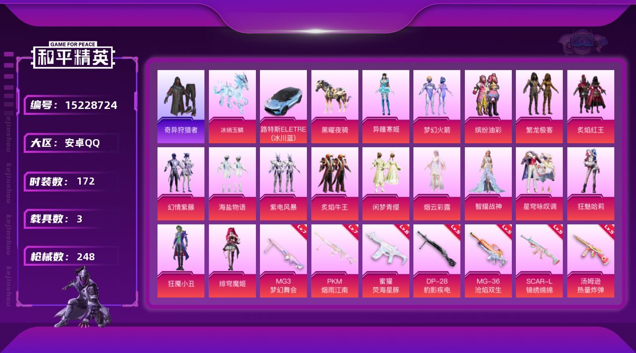 [15228724]【店主推荐捡漏号!可直接换绑】/素材身法号 安卓 手Q-16粉装-11特效枪-3载具-9粉色飞行器-8.5w热力值-13王牌印记-172套装-248枪皮【热门品类】:粉装-梦幻火箭,粉装-缤纷油彩,粉装-繁龙极客,套装-奇异狩猎者,角色-8号机,角色-Mark.06,套装-红熊茄茄【粉色载具】:路特斯ELETRE(冰川蓝),黑曜夜骑,冰绡玉鳞【粉色套装】:粉装-梦幻火箭,粉装-缤纷油彩,粉装-炙焰红王,粉装-幻情紫藤,粉装-海盐物语,粉装-紫电风暴,粉装-炙焰牛王,粉装-闲梦青缨,粉装-繁龙极客,角色-烟云彩露,角色-智耀战神,粉装-星穹咏叹调,角色-狂魅哈莉,角色-狂魇小丑,角色-绯穹魔姬,角色-异瞳寒姬【粉色枪皮等级】:SCAR-L-锦绣绵绵(五级),SCAR-L-魔童闹海 哪吒(三级),蜜獾-荧海星豚(六级),汤姆逊-热量炸弹(五级),Kar98K-巳巳如意(五级),Mk14-甜梦熊击(五级),DP-28-豹影疾电(五级),MG3-梦幻舞会(七级),PKM-江南烟雨(七级),MG-36-沧焰双生(五级),镰刀-幽影之判(三级)【粉色飞行器】:梦幻火箭飞行器,天之羽翼飞行器,庄周梦蝶飞行器,繁龙极客飞行器,初号机 觉醒Ver.飞行器,飞天猪飞行器,灵珠游龙飞行器