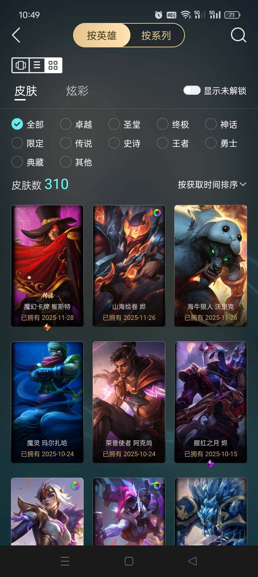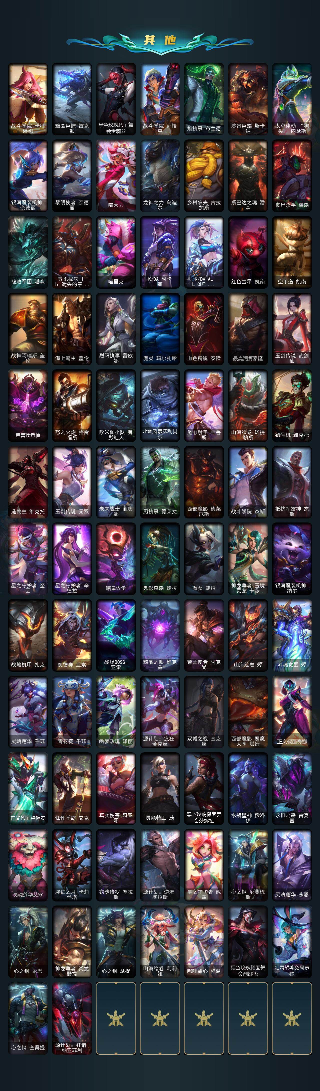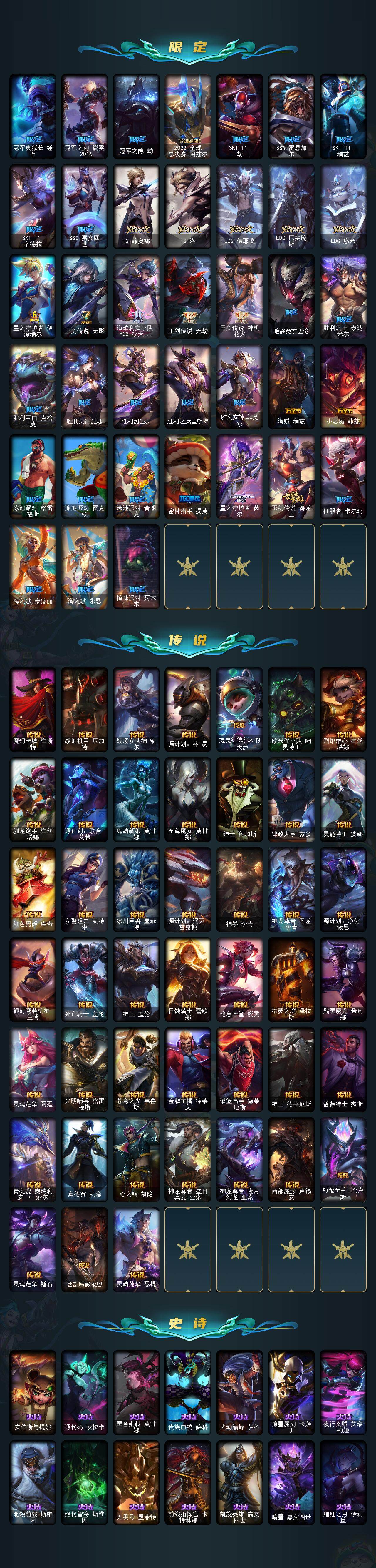 【限定皮肤】:冠军典狱长锤石,冠军之刃锐雯2016,冠军之隐劫,2022全球总决赛阿兹尔,SKTT1劫,SSW雷恩加尔,SKTT1瑞兹,SKTT1辛德拉,SSG嘉文四世,iG菲奥娜,iG洛,EDG佛耶戈,EDG厄斐琉斯,EDG悠米,星之守护者伊泽瑞尔,玉剑传说无影,海珀利安小队Y03权天使卡蜜尔,玉剑传说无劫,玉剑传说神机花火,暗裔英雄盖伦,胜利之王泰达米尔,胜利巨口克格莫,胜利女神娑娜,胜利剑圣易,胜利之运崔斯特,胜利女神菲奥娜,海贼瑞兹,小恶魔菲兹,泳池派对格雷福斯,泳池派对雷克顿,泳池派对普朗克,密林猎