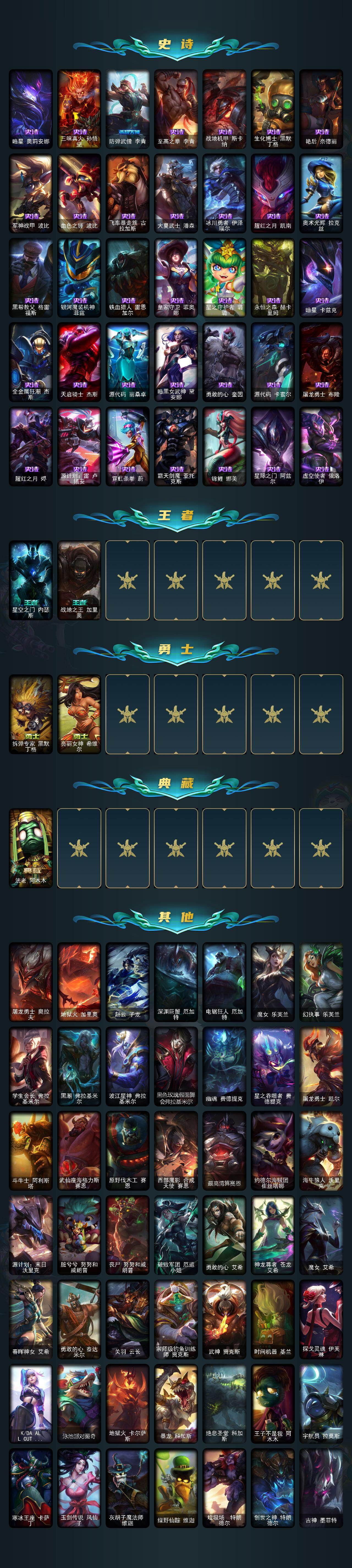 【神话皮肤】:殿堂传奇乐芙兰,十五周年纪念希维尔,殿堂传奇薇恩,永恒之森奥恩,海克斯科技雷克顿,摄魂使者薇恩,至臻真实伤害亚索,至臻至高天奎桑提,至臻暗星墨菲特,至臻北极星钢影卡蜜尔,至臻电玩女神凯特琳,至臻幻灵战斗猫金克丝,至臻KDA阿卡丽,至臻魔女阿卡丽,至臻魔女乐芙兰,至臻神龙尊者均衡之龙沃利贝尔,至臻星之守护者艾克,至臻源计划正义艾瑞莉娅