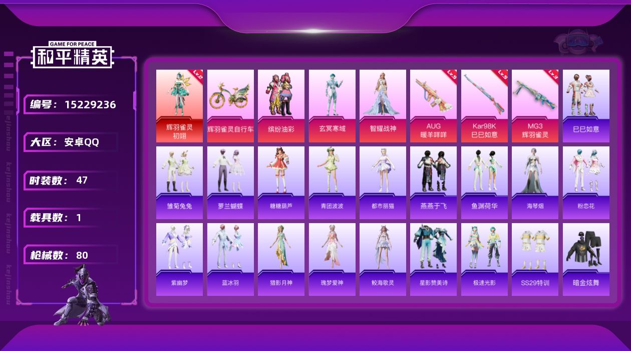 [15229236]【暑期末清货/特价急出/永久包赔/商品详情看图】:安卓 手Q-1红装-3粉装-3特效枪-1载具-2.6w热力值-2印记-47套装-80枪皮【角色神装等级】:辉羽雀灵-初翊(二级)【稀有载具】:辉羽雀灵自行车【特效枪等级】:AUG-暖羊咩咩(五级),Kar98K-巳巳如意(五级),MG3-辉羽雀灵(三级)【优质套装】:粉装-缤纷油彩,角色-玄冥寒域,角色-智耀战神