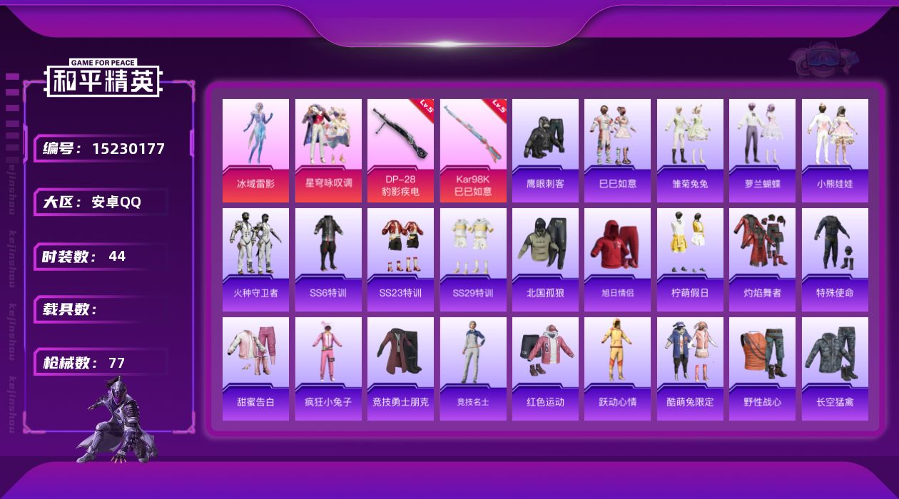 [15230177]【店主推荐捡漏号!可直接换绑】安卓 手Q-2粉装-2特效枪-0载具-0粉色飞行器-20065热力值-1王牌印记-44套装-77枪皮【粉色套装】:角色-冰域雷影,粉装-星穹咏叹调【粉色枪皮等级】:Kar98K-巳巳如意(五级),DP-28-豹影疾电(五级)【粉色枪皮】:Kar98K-巳巳如意,DP-28-豹影疾电