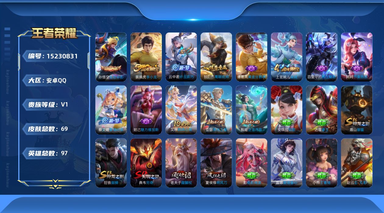 - PX_2095141-贵族7/皮肤228/典藏1/传说7/史诗53/英雄123/全息碎影/宫本武藏黑崎一护/优雅恋人/女武神/特工战影/末日机甲女/仲夏夜之梦/黄金狮子座/一念神魔/云鹰飞将/时雨天司/逐花归海/狰/姜子牙天穹之誓/狄仁杰阴阳师/凯尔特女王/赵云皇家上将/优雅恋人/狮舞东方/蜃楼王/高渐离死亡摇滚/钟无艳王者之锤/妖精王/炼金王/重明/赤莲之焰/云间偶戏/元歌无心/朔风刀/烛龙/穷
